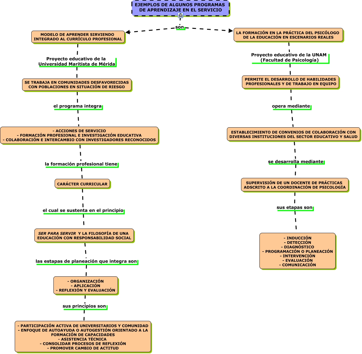 Este Cmap, tiene información relacionada con: CAP. 4 E, LA FORMACIÓN EN LA PRÁCTICA DEL PSICÓLOGO DE LA EDUCACIÓN EN ESCENARIOS REALES Proyecto educativo de la UNAM (Facultad de Psicología) PERMITE EL DESARROLLO DE HABILIDADES PROFESIONALES Y DE TRABAJO EN EQUIPO, SUPERVISIÓN DE UN DOCENTE DE PRÁCTICAS ADSCRITO A LA COORDINACIÓN DE PSICOLOGÍA sus etapas son - INDUCCIÓN - DETECCIÓN - DIAGNÓSTICO - PROGRAMACIÓN O PLANEACIÓN - INTERVENCIÓN - EVALUACIÓN - COMUNICACIÓN, - ACCIONES DE SERVICIO - FORMACIÓN PROFESIONAL E INVESTIGACIÓN EDUCATIVA - COLABORACIÓN E INTERCAMBIO CON INVESTIGADORES RECONOCIDOS la formación profesional tiene CARÁCTER CURRICULAR, SE TRABAJA EN COMUNIDADES DESFAVORECIDAS CON POBLACIONES EN SITUACIÓN DE RIESGO el programa integra - ACCIONES DE SERVICIO - FORMACIÓN PROFESIONAL E INVESTIGACIÓN EDUCATIVA - COLABORACIÓN E INTERCAMBIO CON INVESTIGADORES RECONOCIDOS, MODELO DE APRENDER SIRVIENDO INTEGRADO AL CURRÍCULO PROFESIONAL Proyecto educativo de la Universidad Maritista de Mérida SE TRABAJA EN COMUNIDADES DESFAVORECIDAS CON POBLACIONES EN SITUACIÓN DE RIESGO, PERMITE EL DESARROLLO DE HABILIDADES PROFESIONALES Y DE TRABAJO EN EQUIPO opera mediante ESTABLECIMIENTO DE CONVENIOS DE COLABORACIÓN CON DIVERSAS INSTITUCIONES DEL SECTOR EDUCATIVO Y SALUD, EJEMPLOS DE ALGUNOS PROGRAMAS DE APRENDIZAJE EN EL SERVICIO son LA FORMACIÓN EN LA PRÁCTICA DEL PSICÓLOGO DE LA EDUCACIÓN EN ESCENARIOS REALES, - ORGANIZACIÓN - APLICACIÓN - REFLEXIÓN Y EVALUACIÓN sus principios son - PARTICIPACIÓN ACTIVA DE UNIVERSITARIOS Y COMUNIDAD - ENFOQUE DE AUTOAYUDA O AUTOGESTIÓN ORIENTADO A LA FORMACIÓN DE CAPACIDADES - ASISTENCIA TÉCNICA - CONSOLIDAR PROCESOS DE REFLEXIÓN - PROMOVER CAMBIO DE ACTITUD, ESTABLECIMIENTO DE CONVENIOS DE COLABORACIÓN CON DIVERSAS INSTITUCIONES DEL SECTOR EDUCATIVO Y SALUD se desarrolla mediante SUPERVISIÓN DE UN DOCENTE DE PRÁCTICAS ADSCRITO A LA COORDINACIÓN DE PSICOLOGÍA, EJEMPLOS DE ALGUNOS PROGRAMAS DE APRENDIZAJE EN EL SERVICIO son MODELO DE APRENDER SIRVIENDO INTEGRADO AL CURRÍCULO PROFESIONAL, CARÁCTER CURRICULAR el cual se sustenta en el principio SER PARA SERVIR Y LA FILOSOFÍA DE UNA EDUCACIÓN CON RESPONSABILIDAD SOCIAL, SER PARA SERVIR Y LA FILOSOFÍA DE UNA EDUCACIÓN CON RESPONSABILIDAD SOCIAL las estapas de planeación que integra son - ORGANIZACIÓN - APLICACIÓN - REFLEXIÓN Y EVALUACIÓN
