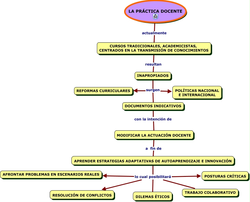 Este Cmap, tiene información relacionada con: CAP. INTRODUCCION, INAPROPIADOS surgen POLÍTICAS NACIONAL E INTERNACIONAL, CURSOS TRADICIONALES, ACADEMICISTAS, CENTRADOS EN LA TRANSMISIÓN DE CONOCIMIENTOS resultan INAPROPIADOS, MODIFICAR LA ACTUACIÓN DOCENTE a fin de APRENDER ESTRATEGIAS ADAPTATIVAS DE AUTOAPRENDIZAJE E INNOVACIÓN, APRENDER ESTRATEGIAS ADAPTATIVAS DE AUTOAPRENDIZAJE E INNOVACIÓN lo cual posibilitará AFRONTAR PROBLEMAS EN ESCENARIOS REALES, APRENDER ESTRATEGIAS ADAPTATIVAS DE AUTOAPRENDIZAJE E INNOVACIÓN lo cual posibilitará TRABAJO COLABORATIVO, INAPROPIADOS surgen DOCUMENTOS INDICATIVOS, DOCUMENTOS INDICATIVOS con la intención de MODIFICAR LA ACTUACIÓN DOCENTE, LA PRÁCTICA DOCENTE actualmente CURSOS TRADICIONALES, ACADEMICISTAS, CENTRADOS EN LA TRANSMISIÓN DE CONOCIMIENTOS, APRENDER ESTRATEGIAS ADAPTATIVAS DE AUTOAPRENDIZAJE E INNOVACIÓN lo cual posibilitará POSTURAS CRÍTICAS, APRENDER ESTRATEGIAS ADAPTATIVAS DE AUTOAPRENDIZAJE E INNOVACIÓN lo cual posibilitará RESOLUCIÓN DE CONFLICTOS, APRENDER ESTRATEGIAS ADAPTATIVAS DE AUTOAPRENDIZAJE E INNOVACIÓN lo cual posibilitará DILEMAS ÉTICOS, INAPROPIADOS surgen REFORMAS CURRICULARES