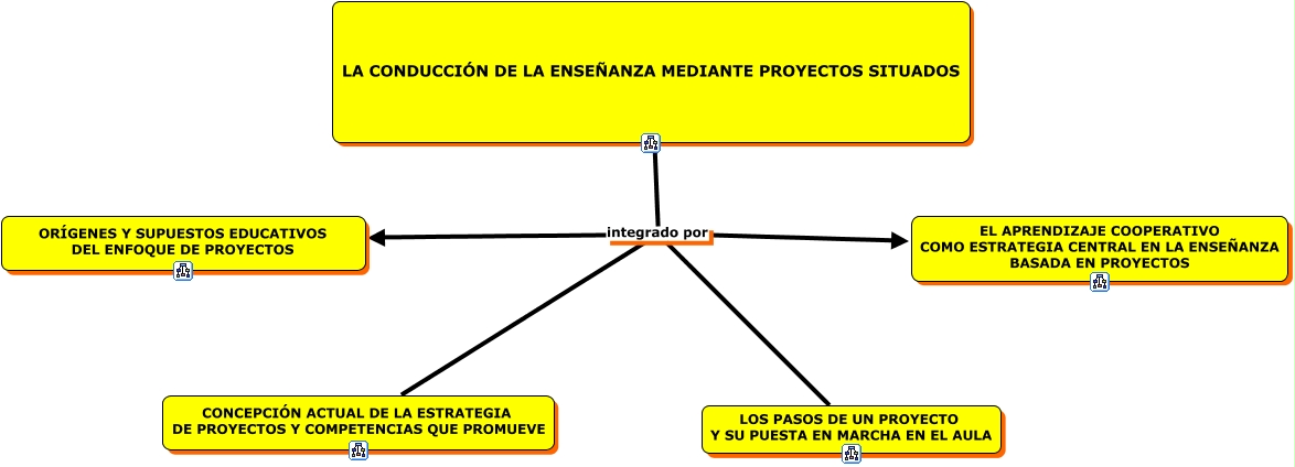 Este Cmap, tiene información relacionada con: CAP. 2, LA CONDUCCIÓN DE LA ENSEÑANZA MEDIANTE PROYECTOS SITUADOS integrado por LOS PASOS DE UN PROYECTO Y SU PUESTA EN MARCHA EN EL AULA, LA CONDUCCIÓN DE LA ENSEÑANZA MEDIANTE PROYECTOS SITUADOS integrado por EL APRENDIZAJE COOPERATIVO COMO ESTRATEGIA CENTRAL EN LA ENSEÑANZA BASADA EN PROYECTOS, LA CONDUCCIÓN DE LA ENSEÑANZA MEDIANTE PROYECTOS SITUADOS integrado por CONCEPCIÓN ACTUAL DE LA ESTRATEGIA DE PROYECTOS Y COMPETENCIAS QUE PROMUEVE, LA CONDUCCIÓN DE LA ENSEÑANZA MEDIANTE PROYECTOS SITUADOS integrado por ORÍGENES Y SUPUESTOS EDUCATIVOS DEL ENFOQUE DE PROYECTOS