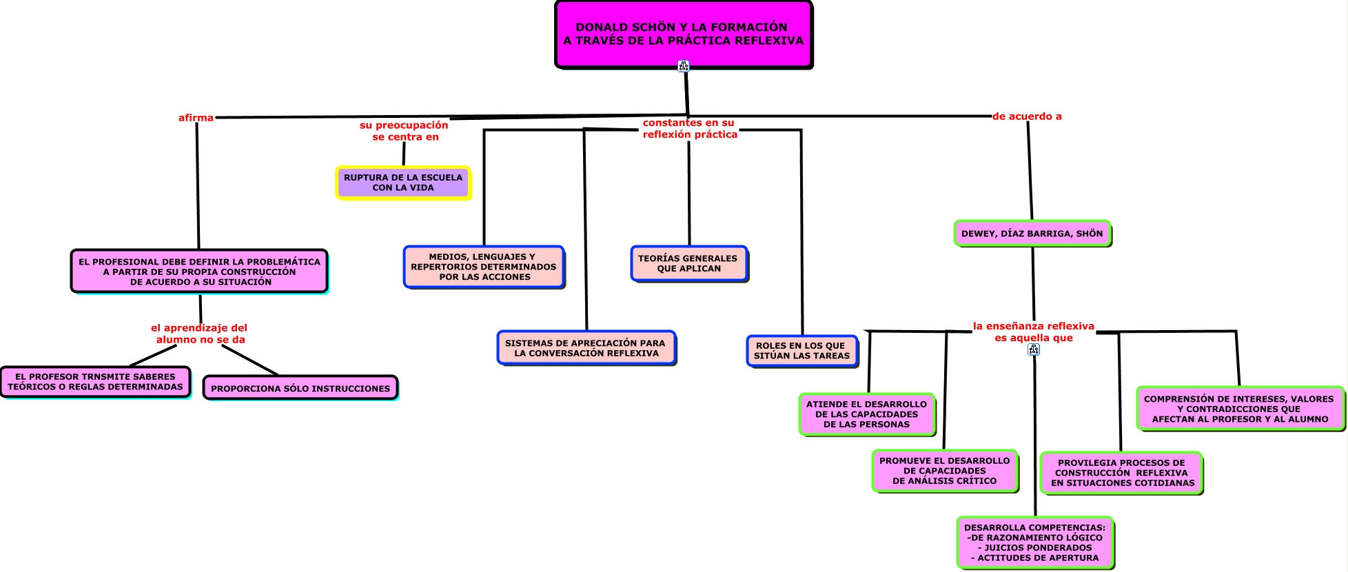 Este Cmap, tiene información relacionada con: CAP. 1 B, DONALD SCHÖN Y LA FORMACIÓN A TRAVÉS DE LA PRÁCTICA REFLEXIVA de acuerdo a DEWEY, DÍAZ BARRIGA, SHÖN, DEWEY, DÍAZ BARRIGA, SHÖN la enseñanza reflexiva es aquella que PROVILEGIA PROCESOS DE CONSTRUCCIÓN REFLEXIVA EN SITUACIONES COTIDIANAS, DONALD SCHÖN Y LA FORMACIÓN A TRAVÉS DE LA PRÁCTICA REFLEXIVA constantes en su reflexión práctica ROLES EN LOS QUE SITÚAN LAS TAREAS, DONALD SCHÖN Y LA FORMACIÓN A TRAVÉS DE LA PRÁCTICA REFLEXIVA constantes en su reflexión práctica SISTEMAS DE APRECIACIÓN PARA LA CONVERSACIÓN REFLEXIVA, EL PROFESIONAL DEBE DEFINIR LA PROBLEMÁTICA A PARTIR DE SU PROPIA CONSTRUCCIÓN DE ACUERDO A SU SITUACIÓN el aprendizaje del alumno no se da PROPORCIONA SÓLO INSTRUCCIONES, DEWEY, DÍAZ BARRIGA, SHÖN la enseñanza reflexiva es aquella que COMPRENSIÓN DE INTERESES, VALORES Y CONTRADICCIONES QUE AFECTAN AL PROFESOR Y AL ALUMNO, DEWEY, DÍAZ BARRIGA, SHÖN la enseñanza reflexiva es aquella que DESARROLLA COMPETENCIAS: -DE RAZONAMIENTO LÓGICO - JUICIOS PONDERADOS - ACTITUDES DE APERTURA, DONALD SCHÖN Y LA FORMACIÓN A TRAVÉS DE LA PRÁCTICA REFLEXIVA constantes en su reflexión práctica MEDIOS, LENGUAJES Y REPERTORIOS DETERMINADOS POR LAS ACCIONES, DONALD SCHÖN Y LA FORMACIÓN A TRAVÉS DE LA PRÁCTICA REFLEXIVA constantes en su reflexión práctica TEORÍAS GENERALES QUE APLICAN, DEWEY, DÍAZ BARRIGA, SHÖN la enseñanza reflexiva es aquella que ATIENDE EL DESARROLLO DE LAS CAPACIDADES DE LAS PERSONAS, DONALD SCHÖN Y LA FORMACIÓN A TRAVÉS DE LA PRÁCTICA REFLEXIVA su preocupación se centra en RUPTURA DE LA ESCUELA CON LA VIDA, EL PROFESIONAL DEBE DEFINIR LA PROBLEMÁTICA A PARTIR DE SU PROPIA CONSTRUCCIÓN DE ACUERDO A SU SITUACIÓN el aprendizaje del alumno no se da EL PROFESOR TRNSMITE SABERES TEÓRICOS O REGLAS DETERMINADAS, DONALD SCHÖN Y LA FORMACIÓN A TRAVÉS DE LA PRÁCTICA REFLEXIVA afirma EL PROFESIONAL DEBE DEFINIR LA PROBLEMÁTICA A PARTIR DE SU PROPIA CONSTRUCCIÓN DE ACUERDO A SU SITUACIÓN, DEWEY, DÍAZ BARRIGA, SHÖN la enseñanza reflexiva es aquella que PROMUEVE EL DESARROLLO DE CAPACIDADES DE ANÁLISIS CRÍTICO