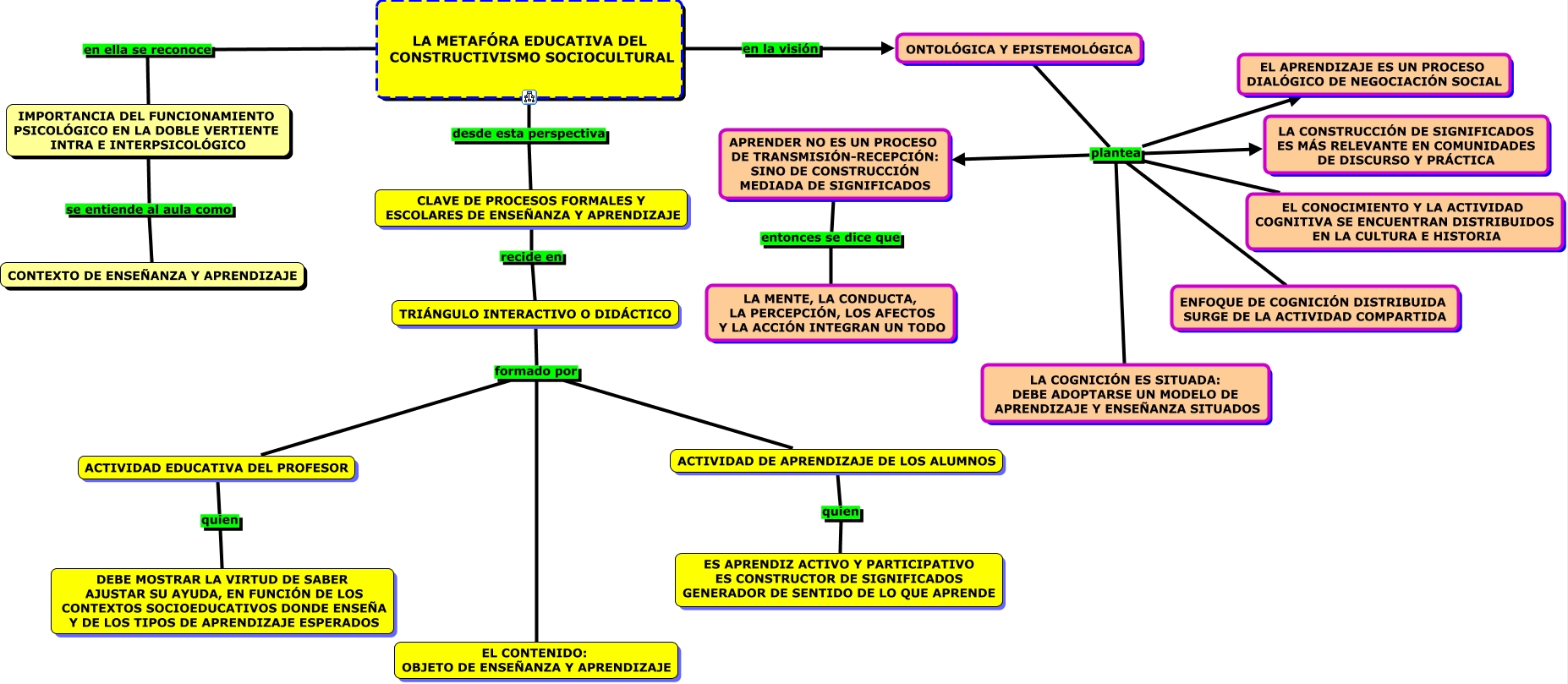 Este Cmap, tiene información relacionada con: CAP. 1 C, ONTOLÓGICA Y EPISTEMOLÓGICA plantea LA COGNICIÓN ES SITUADA: DEBE ADOPTARSE UN MODELO DE APRENDIZAJE Y ENSEÑANZA SITUADOS, CLAVE DE PROCESOS FORMALES Y ESCOLARES DE ENSEÑANZA Y APRENDIZAJE recide en TRIÁNGULO INTERACTIVO O DIDÁCTICO, ONTOLÓGICA Y EPISTEMOLÓGICA plantea EL CONOCIMIENTO Y LA ACTIVIDAD COGNITIVA SE ENCUENTRAN DISTRIBUIDOS EN LA CULTURA E HISTORIA, LA METAFÓRA EDUCATIVA DEL CONSTRUCTIVISMO SOCIOCULTURAL en ella se reconoce IMPORTANCIA DEL FUNCIONAMIENTO PSICOLÓGICO EN LA DOBLE VERTIENTE INTRA E INTERPSICOLÓGICO, IMPORTANCIA DEL FUNCIONAMIENTO PSICOLÓGICO EN LA DOBLE VERTIENTE INTRA E INTERPSICOLÓGICO se entiende al aula como CONTEXTO DE ENSEÑANZA Y APRENDIZAJE, APRENDER NO ES UN PROCESO DE TRANSMISIÓN-RECEPCIÓN: SINO DE CONSTRUCCIÓN MEDIADA DE SIGNIFICADOS entonces se dice que LA MENTE, LA CONDUCTA, LA PERCEPCIÓN, LOS AFECTOS Y LA ACCIÓN INTEGRAN UN TODO, LA METAFÓRA EDUCATIVA DEL CONSTRUCTIVISMO SOCIOCULTURAL desde esta perspectiva CLAVE DE PROCESOS FORMALES Y ESCOLARES DE ENSEÑANZA Y APRENDIZAJE, ACTIVIDAD EDUCATIVA DEL PROFESOR quien DEBE MOSTRAR LA VIRTUD DE SABER AJUSTAR SU AYUDA, EN FUNCIÓN DE LOS CONTEXTOS SOCIOEDUCATIVOS DONDE ENSEÑA Y DE LOS TIPOS DE APRENDIZAJE ESPERADOS, TRIÁNGULO INTERACTIVO O DIDÁCTICO formado por ACTIVIDAD DE APRENDIZAJE DE LOS ALUMNOS, TRIÁNGULO INTERACTIVO O DIDÁCTICO formado por EL CONTENIDO: OBJETO DE ENSEÑANZA Y APRENDIZAJE, ONTOLÓGICA Y EPISTEMOLÓGICA plantea EL APRENDIZAJE ES UN PROCESO DIALÓGICO DE NEGOCIACIÓN SOCIAL, ONTOLÓGICA Y EPISTEMOLÓGICA plantea APRENDER NO ES UN PROCESO DE TRANSMISIÓN-RECEPCIÓN: SINO DE CONSTRUCCIÓN MEDIADA DE SIGNIFICADOS, LA METAFÓRA EDUCATIVA DEL CONSTRUCTIVISMO SOCIOCULTURAL en la visión ONTOLÓGICA Y EPISTEMOLÓGICA, ONTOLÓGICA Y EPISTEMOLÓGICA plantea ENFOQUE DE COGNICIÓN DISTRIBUIDA SURGE DE LA ACTIVIDAD COMPARTIDA, ONTOLÓGICA Y EPISTEMOLÓGICA plantea LA CONSTRUCCIÓN DE SIGNIFICADOS ES MÁS RELEVANTE EN COMUNIDADES DE DISCURSO Y PRÁCTICA, TRIÁNGULO INTERACTIVO O DIDÁCTICO formado por ACTIVIDAD EDUCATIVA DEL PROFESOR, ACTIVIDAD DE APRENDIZAJE DE LOS ALUMNOS quien ES APRENDIZ ACTIVO Y PARTICIPATIVO ES CONSTRUCTOR DE SIGNIFICADOS GENERADOR DE SENTIDO DE LO QUE APRENDE