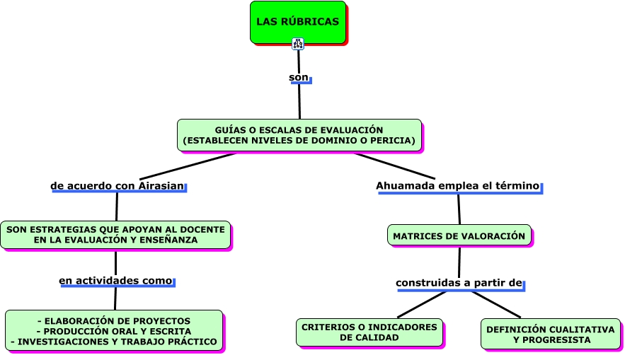 Este Cmap, tiene información relacionada con: CAP. 5 B, GUÍAS O ESCALAS DE EVALUACIÓN (ESTABLECEN NIVELES DE DOMINIO O PERICIA) Ahuamada emplea el término MATRICES DE VALORACIÓN, SON ESTRATEGIAS QUE APOYAN AL DOCENTE EN LA EVALUACIÓN Y ENSEÑANZA en actividades como - ELABORACIÓN DE PROYECTOS - PRODUCCIÓN ORAL Y ESCRITA - INVESTIGACIONES Y TRABAJO PRÁCTICO, MATRICES DE VALORACIÓN construidas a partir de CRITERIOS O INDICADORES DE CALIDAD, LAS RÚBRICAS son GUÍAS O ESCALAS DE EVALUACIÓN (ESTABLECEN NIVELES DE DOMINIO O PERICIA), GUÍAS O ESCALAS DE EVALUACIÓN (ESTABLECEN NIVELES DE DOMINIO O PERICIA) de acuerdo con Airasian SON ESTRATEGIAS QUE APOYAN AL DOCENTE EN LA EVALUACIÓN Y ENSEÑANZA, MATRICES DE VALORACIÓN construidas a partir de DEFINICIÓN CUALITATIVA Y PROGRESISTA