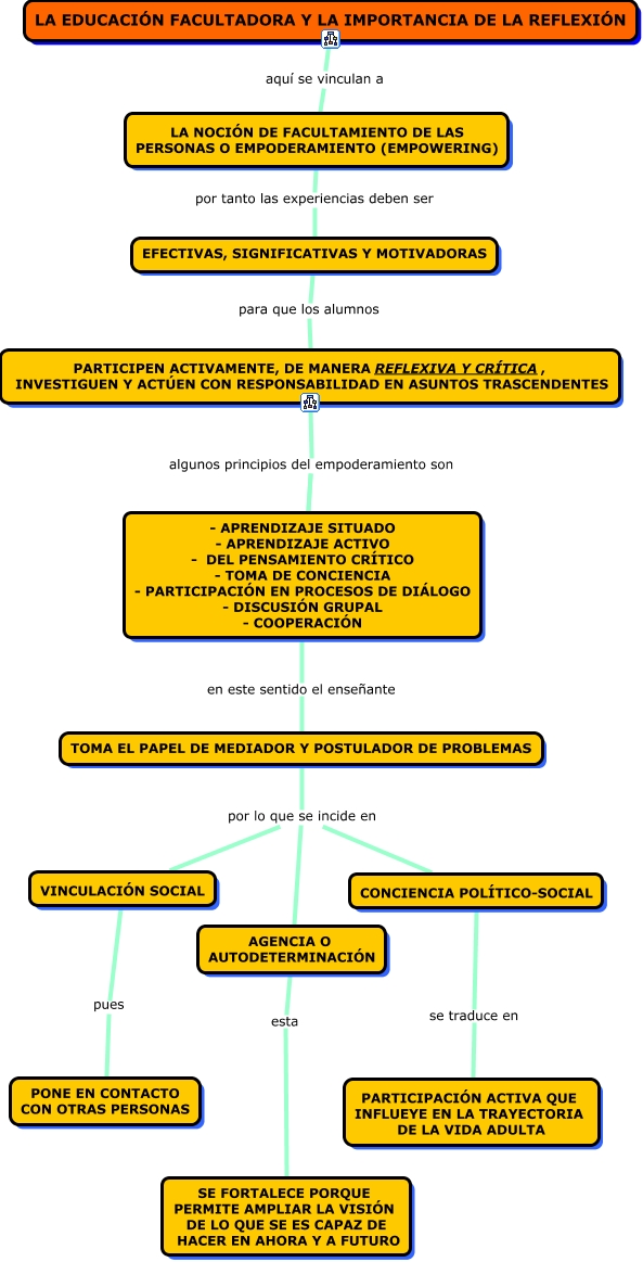 Este Cmap, tiene información relacionada con: CAP. 4 B, TOMA EL PAPEL DE MEDIADOR Y POSTULADOR DE PROBLEMAS por lo que se incide en CONCIENCIA POLÍTICO-SOCIAL, CONCIENCIA POLÍTICO-SOCIAL se traduce en PARTICIPACIÓN ACTIVA QUE INFLUEYE EN LA TRAYECTORIA DE LA VIDA ADULTA, AGENCIA O AUTODETERMINACIÓN esta SE FORTALECE PORQUE PERMITE AMPLIAR LA VISIÓN DE LO QUE SE ES CAPAZ DE HACER EN AHORA Y A FUTURO, PARTICIPEN ACTIVAMENTE, DE MANERA REFLEXIVA Y CRÍTICA, INVESTIGUEN Y ACTÚEN CON RESPONSABILIDAD EN ASUNTOS TRASCENDENTES algunos principios del empoderamiento son - APRENDIZAJE SITUADO - APRENDIZAJE ACTIVO - DEL PENSAMIENTO CRÍTICO - TOMA DE CONCIENCIA - PARTICIPACIÓN EN PROCESOS DE DIÁLOGO - DISCUSIÓN GRUPAL - COOPERACIÓN, VINCULACIÓN SOCIAL pues PONE EN CONTACTO CON OTRAS PERSONAS, LA EDUCACIÓN FACULTADORA Y LA IMPORTANCIA DE LA REFLEXIÓN aquí se vinculan a LA NOCIÓN DE FACULTAMIENTO DE LAS PERSONAS O EMPODERAMIENTO (EMPOWERING), TOMA EL PAPEL DE MEDIADOR Y POSTULADOR DE PROBLEMAS por lo que se incide en AGENCIA O AUTODETERMINACIÓN, TOMA EL PAPEL DE MEDIADOR Y POSTULADOR DE PROBLEMAS por lo que se incide en VINCULACIÓN SOCIAL, - APRENDIZAJE SITUADO - APRENDIZAJE ACTIVO - DEL PENSAMIENTO CRÍTICO - TOMA DE CONCIENCIA - PARTICIPACIÓN EN PROCESOS DE DIÁLOGO - DISCUSIÓN GRUPAL - COOPERACIÓN en este sentido el enseñante TOMA EL PAPEL DE MEDIADOR Y POSTULADOR DE PROBLEMAS, PARTICIPEN ACTIVAMENTE, DE MANERA REFLEXIVA Y CRÍTICA, INVESTIGUEN Y ACTÚEN CON RESPONSABILIDAD EN ASUNTOS TRASCENDENTES algunos principios del empoderamiento son - APRENDIZAJE SITUADO - APRENDIZAJE ACTIVO - DEL PENSAMIENTO CRÍTICO - TOMA DE CONCIENCIA - PARTICIPACIÓN EN PROCESOS DE DIÁLOGO - DISCUSIÓN GRUPAL - COOPERACIÓN, EFECTIVAS, SIGNIFICATIVAS Y MOTIVADORAS para que los alumnos PARTICIPEN ACTIVAMENTE, DE MANERA REFLEXIVA Y CRÍTICA, INVESTIGUEN Y ACTÚEN CON RESPONSABILIDAD EN ASUNTOS TRASCENDENTES, LA NOCIÓN DE FACULTAMIENTO DE LAS PERSONAS O EMPODERAMIENTO (EMPOWERING) por tanto las experiencias deben ser EFECTIVAS, SIGNIFICATIVAS Y MOTIVADORAS