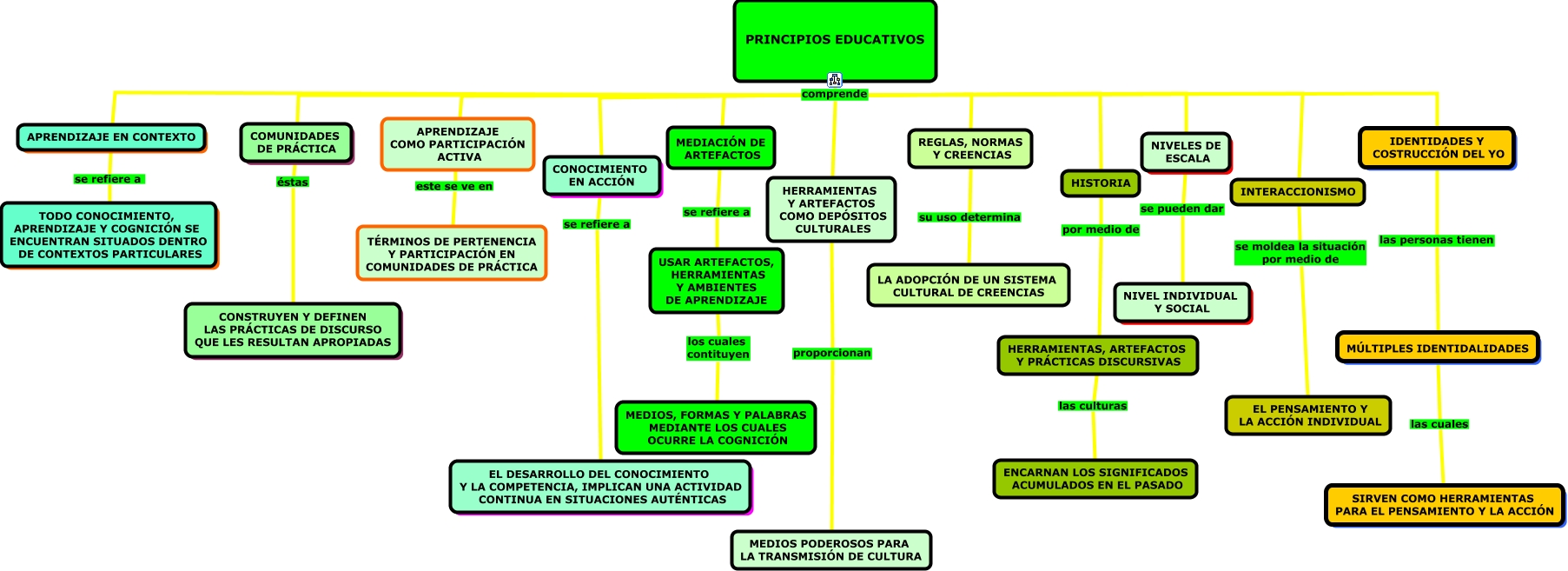 Este Cmap, tiene información relacionada con: CAP. 1 D-1, REGLAS, NORMAS Y CREENCIAS su uso determina LA ADOPCIÓN DE UN SISTEMA CULTURAL DE CREENCIAS, HERRAMIENTAS, ARTEFACTOS Y PRÁCTICAS DISCURSIVAS las culturas ENCARNAN LOS SIGNIFICADOS ACUMULADOS EN EL PASADO, INTERACCIONISMO se moldea la situación por medio de EL PENSAMIENTO Y LA ACCIÓN INDIVIDUAL, CONOCIMIENTO EN ACCIÓN se refiere a EL DESARROLLO DEL CONOCIMIENTO Y LA COMPETENCIA, IMPLICAN UNA ACTIVIDAD CONTINUA EN SITUACIONES AUTÉNTICAS, NIVELES DE ESCALA se pueden dar NIVEL INDIVIDUAL Y SOCIAL, MEDIACIÓN DE ARTEFACTOS se refiere a USAR ARTEFACTOS, HERRAMIENTAS Y AMBIENTES DE APRENDIZAJE, PRINCIPIOS EDUCATIVOS comprende NIVELES DE ESCALA, PRINCIPIOS EDUCATIVOS comprende CONOCIMIENTO EN ACCIÓN, HISTORIA por medio de HERRAMIENTAS, ARTEFACTOS Y PRÁCTICAS DISCURSIVAS, MÚLTIPLES IDENTIDALIDADES las cuales SIRVEN COMO HERRAMIENTAS PARA EL PENSAMIENTO Y LA ACCIÓN, PRINCIPIOS EDUCATIVOS comprende REGLAS, NORMAS Y CREENCIAS, PRINCIPIOS EDUCATIVOS comprende IDENTIDADES Y COSTRUCCIÓN DEL YO, PRINCIPIOS EDUCATIVOS comprende MEDIACIÓN DE ARTEFACTOS, PRINCIPIOS EDUCATIVOS comprende APRENDIZAJE EN CONTEXTO, APRENDIZAJE EN CONTEXTO se refiere a TODO CONOCIMIENTO, APRENDIZAJE Y COGNICIÓN SE ENCUENTRAN SITUADOS DENTRO DE CONTEXTOS PARTICULARES, PRINCIPIOS EDUCATIVOS comprende HERRAMIENTAS Y ARTEFACTOS COMO DEPÓSITOS CULTURALES, PRINCIPIOS EDUCATIVOS comprende APRENDIZAJE COMO PARTICIPACIÓN ACTIVA, HERRAMIENTAS Y ARTEFACTOS COMO DEPÓSITOS CULTURALES proporcionan MEDIOS PODEROSOS PARA LA TRANSMISIÓN DE CULTURA, IDENTIDADES Y COSTRUCCIÓN DEL YO las personas tienen MÚLTIPLES IDENTIDALIDADES, COMUNIDADES DE PRÁCTICA éstas CONSTRUYEN Y DEFINEN LAS PRÁCTICAS DE DISCURSO QUE LES RESULTAN APROPIADAS