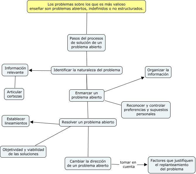 Este Cmap, tiene información relacionada con: 17. Los problemas Cap. 3, Enmarcar un problema abierto ???? Reconocer y controlar preferencias y supuestos personales, Información relevante ???? Articular certezas, Identificar la naturaleza del problema ???? Información relevante, Identificar la naturaleza del problema ???? Resolver un problema abierto, Identificar la naturaleza del problema ???? Enmarcar un problema abierto, Los problemas sobre los que es más valioso enseñar son problemas abiertos, indefinidos o no estructurados. ???? Pasos del procesos de solución de un problema abierto, Resolver un problema abierto ???? Cambiar la dirección de un problema abierto, Resolver un problema abierto ???? Establecer lineamientos, Cambiar la dirección de un problema abierto tomar en cuenta Factores que justifiquen el replanteamiento del problema, Pasos del procesos de solución de un problema abierto ???? Identificar la naturaleza del problema, Resolver un problema abierto ???? Objetividad y viabilidad de las soluciones, Enmarcar un problema abierto ???? Organizar la información