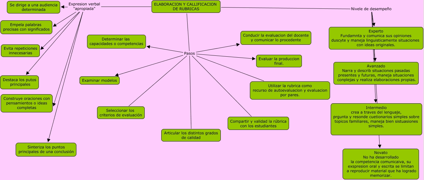 Este Cmap, tiene información relacionada con: CAPITULO 5 TRES, ELABORACION Y CALLIFICACION DE RUBRICAS Expresion verbal "apropiada" Se dirige a una audiencia determinada, ELABORACION Y CALLIFICACION DE RUBRICAS Pasos Conducir la evaluacion del docente y comunicar lo procedente, ELABORACION Y CALLIFICACION DE RUBRICAS Expresion verbal "apropiada" Empela palabras precisas con significados, ELABORACION Y CALLIFICACION DE RUBRICAS Pasos Examinar modelos, ELABORACION Y CALLIFICACION DE RUBRICAS Nivele de desempeño Experto Fundamnta y comunica sus opiniones duscyte y maneja linguisticamente situaciones con ideas originales., ELABORACION Y CALLIFICACION DE RUBRICAS Expresion verbal "apropiada" Construye oraciones con pensamientos o ideas completas, ELABORACION Y CALLIFICACION DE RUBRICAS Nivele de desempeño Novato No ha desarrollado la competencia comunicaiva, su exspresion oral y escrita se limitan a reproducir material que ha logrado memorizar., ELABORACION Y CALLIFICACION DE RUBRICAS Expresion verbal "apropiada" Evita repeticiones innecesarias, ELABORACION Y CALLIFICACION DE RUBRICAS Pasos Seleccionar los criterios de evaluación, ELABORACION Y CALLIFICACION DE RUBRICAS Pasos Utilizar la rubrica como recurso de autoevaluacion y evaluacion por pares., ELABORACION Y CALLIFICACION DE RUBRICAS Expresion verbal "apropiada" Sinteriza los puntos principales de una conclusión, ELABORACION Y CALLIFICACION DE RUBRICAS Pasos Evaluar la produccion final., ELABORACION Y CALLIFICACION DE RUBRICAS Pasos Compartir y validad la rúbrica con los estudiantes, ELABORACION Y CALLIFICACION DE RUBRICAS Expresion verbal "apropiada" Destaca los putos principales, ELABORACION Y CALLIFICACION DE RUBRICAS Pasos Articular los distintos grados de calidad, ELABORACION Y CALLIFICACION DE RUBRICAS Nivele de desempeño Intermedio crea a traves del lenguaje, prgunta y resonde cuetionarios simples sobre topicos familiares, maneja bien sistuasiones simples., ELABORACION Y CALLIFICACION DE RUBRICAS Nivele de desempeño Avanzado Narra y describ situaciones pasadas presentes y futuras, maneja situaciones conplejas y realiza elaboraciones propias., ELABORACION Y CALLIFICACION DE RUBRICAS Pasos Determinar las capacidades o competencias