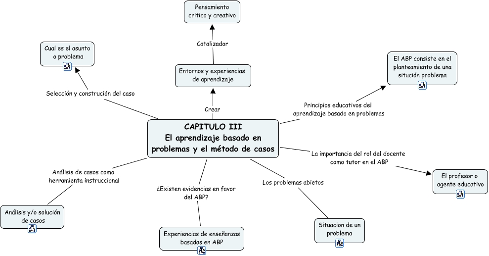 Este Cmap, tiene información relacionada con: CAPITULO 3, CAPITULO III El aprendizaje basado en problemas y el método de casos La importancia del rol del docente como tutor en el ABP El profesor o agente educativo, CAPITULO III El aprendizaje basado en problemas y el método de casos Crear Entornos y experiencias de aprendizaje, CAPITULO III El aprendizaje basado en problemas y el método de casos Selección y construción del caso Cual es el asunto o problema, Entornos y experiencias de aprendizaje Catalizador Pensamiento critico y creativo, CAPITULO III El aprendizaje basado en problemas y el método de casos Análisis de casos como herramienta instruccional Análisis y/o solución de casos, CAPITULO III El aprendizaje basado en problemas y el método de casos Los problemas abietos Situacion de un problema, CAPITULO III El aprendizaje basado en problemas y el método de casos Principios educativos del aprendizaje basado en problemas El ABP consiste en el planteamiento de una situción problema, CAPITULO III El aprendizaje basado en problemas y el método de casos ¿Existen evidencias en favor del ABP? Experiencias de enseñanzas basadas en ABP