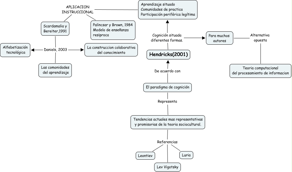 Este Cmap, tiene información relacionada con: PARADIGMAS DE LA COGNICION, El paradigma de cognición De acuerdo con Hendricks(2001), El paradigma de cognición Representa Tendencias actuales mas representativas y promisorias de la teoria sociocultural., Tendencias actuales mas representativas y promisorias de la teoria sociocultural. Referencias Luria, Scardamalia y Bereiter,1991 Daniels, 2003 La construccion colaborativa del conocimiento, Hendricks(2001) Cognición situada diferentes formas. Para muchos autores, Scardamalia y Bereiter,1991 Daniels, 2003 Las comonidades del aprendizaje, Scardamalia y Bereiter,1991 Daniels, 2003 Alfebetización tecnológica, Aprendizaje situado Comunidades de practica Participación periférica legítima APLICACION INSTRUCCIONAL Palincsar y Brown, 1984 Modelo de enseñanza resiproca, Para muchos autores Alternativa opuesta Teoria computacional del procesamiento de informacion, Tendencias actuales mas representativas y promisorias de la teoria sociocultural. Referencias Leontiev, Aprendizaje situado Comunidades de practica Participación periférica legítima APLICACION INSTRUCCIONAL Scardamalia y Bereiter,1991, Hendricks(2001) Cognición situada diferentes formas. Aprendizaje situado Comunidades de practica Participación periférica legítima, Tendencias actuales mas representativas y promisorias de la teoria sociocultural. Referencias Lev Vigotsky