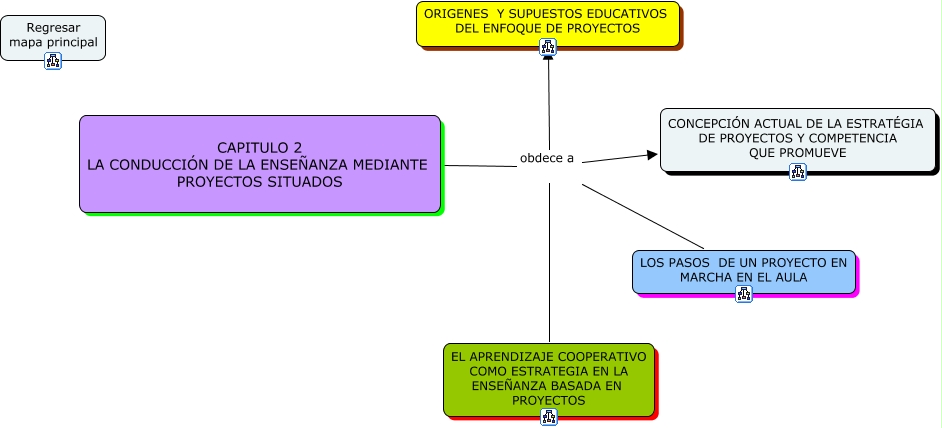 Este Cmap, tiene información relacionada con: CAPITULO 2, CAPITULO 2 LA CONDUCCIÓN DE LA ENSEÑANZA MEDIANTE PROYECTOS SITUADOS obdece a EL APRENDIZAJE COOPERATIVO COMO ESTRATEGIA EN LA ENSEÑANZA BASADA EN PROYECTOS, CAPITULO 2 LA CONDUCCIÓN DE LA ENSEÑANZA MEDIANTE PROYECTOS SITUADOS obdece a CONCEPCIÓN ACTUAL DE LA ESTRATÉGIA DE PROYECTOS Y COMPETENCIA QUE PROMUEVE, CAPITULO 2 LA CONDUCCIÓN DE LA ENSEÑANZA MEDIANTE PROYECTOS SITUADOS obdece a ORIGENES Y SUPUESTOS EDUCATIVOS DEL ENFOQUE DE PROYECTOS, CAPITULO 2 LA CONDUCCIÓN DE LA ENSEÑANZA MEDIANTE PROYECTOS SITUADOS obdece a LOS PASOS DE UN PROYECTO EN MARCHA EN EL AULA