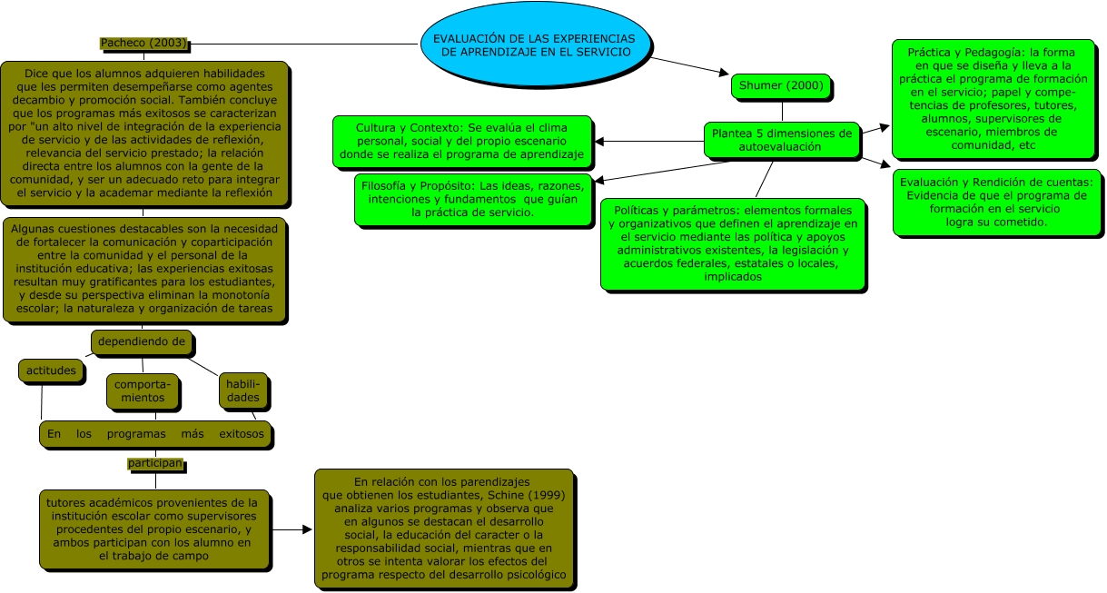 Este Cmap, tiene información relacionada con: experiencias, actitudes ???? En los programas más exitosos, Algunas cuestiones destacables son la necesidad de fortalecer la comunicación y coparticipación entre la comunidad y el personal de la institución educativa; las experiencias exitosas resultan muy gratificantes para los estudiantes, y desde su perspectiva eliminan la monotonía escolar; la naturaleza y organización de tareas ???? dependiendo de, tutores académicos provenientes de la institución escolar como supervisores procedentes del propio escenario, y ambos participan con los alumno en el trabajo de campo ???? En relación con los parendizajes que obtienen los estudiantes, Schine (1999) analiza varios programas y observa que en algunos se destacan el desarrollo social, la educación del caracter o la responsabilidad social, mientras que en otros se intenta valorar los efectos del programa respecto del desarrollo psicológico, dependiendo de ???? habili- dades, EVALUACIÓN DE LAS EXPERIENCIAS DE APRENDIZAJE EN EL SERVICIO Pacheco (2003) Dice que los alumnos adquieren habilidades que les permiten desempeñarse como agentes decambio y promoción social. También concluye que los programas más exitosos se caracterizan por "un alto nivel de integración de la experiencia de servicio y de las actividades de reflexión, relevancia del servicio prestado; la relación directa entre los alumnos con la gente de la comunidad, y ser un adecuado reto para integrar el servicio y la academar mediante la reflexión, Shumer (2000) ???? Plantea 5 dimensiones de autoevaluación, En los programas más exitosos participan tutores académicos provenientes de la institución escolar como supervisores procedentes del propio escenario, y ambos participan con los alumno en el trabajo de campo, Plantea 5 dimensiones de autoevaluación ???? Práctica y Pedagogía: la forma en que se diseña y lleva a la práctica el programa de formación en el servicio; papel y compe- tencias de profesores, tutores, alumnos, supervisores de escenario, miembros de comunidad, etc, Plantea 5 dimensiones de autoevaluación ???? Evaluación y Rendición de cuentas: Evidencia de que el programa de formación en el servicio logra su cometido., habili- dades ???? En los programas más exitosos, Plantea 5 dimensiones de autoevaluación ???? Filosofía y Propósito: Las ideas, razones, intenciones y fundamentos que guían la práctica de servicio., dependiendo de ???? actitudes, comporta- mientos ???? En los programas más exitosos, Plantea 5 dimensiones de autoevaluación ???? Cultura y Contexto: Se evalúa el clima personal, social y del propio escenario donde se realiza el programa de aprendizaje, EVALUACIÓN DE LAS EXPERIENCIAS DE APRENDIZAJE EN EL SERVICIO ???? Shumer (2000), dependiendo de ???? comporta- mientos, Dice que los alumnos adquieren habilidades que les permiten desempeñarse como agentes decambio y promoción social. También concluye que los programas más exitosos se caracterizan por "un alto nivel de integración de la experiencia de servicio y de las actividades de reflexión, relevancia del servicio prestado; la relación directa entre los alumnos con la gente de la comunidad, y ser un adecuado reto para integrar el servicio y la academar mediante la reflexión ???? Algunas cuestiones destacables son la necesidad de fortalecer la comunicación y coparticipación entre la comunidad y el personal de la institución educativa; las experiencias exitosas resultan muy gratificantes para los estudiantes, y desde su perspectiva eliminan la monotonía escolar; la naturaleza y organización de tareas, Plantea 5 dimensiones de autoevaluación ???? Políticas y parámetros: elementos formales y organizativos que definen el aprendizaje en el servicio mediante las política y apoyos administrativos existentes, la legislación y acuerdos federales, estatales o locales, implicados