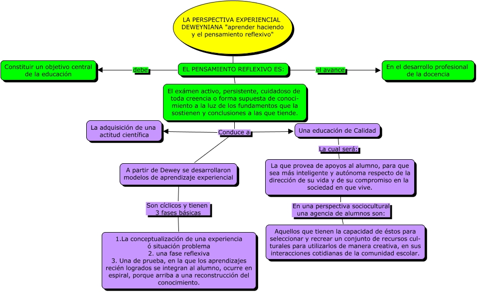 Este Cmap, tiene información relacionada con: John2, EL PENSAMIENTO REFLEXIVO ES: el avance En el desarrollo profesional de la docencia, El exámen activo, persistente, cuidadoso de toda creencia o forma supuesta de conoci- miento a la luz de los fundamentos que la sostienen y conclusiones a las que tiende. Conduce a La adquisición de una actitud científica, El exámen activo, persistente, cuidadoso de toda creencia o forma supuesta de conoci- miento a la luz de los fundamentos que la sostienen y conclusiones a las que tiende. Conduce a Una educación de Calidad, LA PERSPECTIVA EXPERIENCIAL DEWEYNIANA "aprender haciendo y el pensamiento reflexivo" ???? El exámen activo, persistente, cuidadoso de toda creencia o forma supuesta de conoci- miento a la luz de los fundamentos que la sostienen y conclusiones a las que tiende., A partir de Dewey se desarrollaron modelos de aprendizaje experiencial Son cíclicos y tienen 3 fases básicas 1.La conceptualización de una experiencia ó situación problema 2. una fase reflexiva 3. Una de prueba, en la que los aprendizajes recién logrados se integran al alumno, ocurre en espiral, porque arriba a una reconstrucción del conocimiento., Una educación de Calidad La cual será: La que provea de apoyos al alumno, para que sea más inteligente y autónoma respecto de la dirección de su vida y de su compromiso en la sociedad en que vive., EL PENSAMIENTO REFLEXIVO ES: debe Constituir un objetivo central de la educación, La que provea de apoyos al alumno, para que sea más inteligente y autónoma respecto de la dirección de su vida y de su compromiso en la sociedad en que vive. En una perspectiva sociocultural una agencia de alumnos son: Aquellos que tienen la capacidad de éstos para seleccionar y recrear un conjunto de recursos cul- turales para utilizarlos de manera creativa, en sus interacciones cotidianas de la comunidad escolar., El exámen activo, persistente, cuidadoso de toda creencia o forma supuesta de conoci- miento a la luz de los fundamentos que la sostienen y conclusiones a las que tiende. Conduce a A partir de Dewey se desarrollaron modelos de aprendizaje experiencial