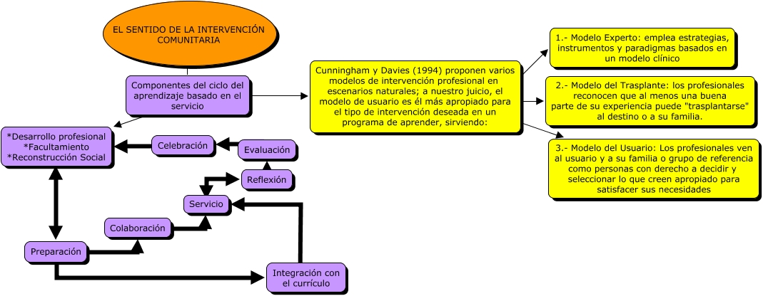 Este Cmap, tiene información relacionada con: sentido, Componentes del ciclo del aprendizaje basado en el servicio ???? Cunningham y Davies (1994) proponen varios modelos de intervención profesional en escenarios naturales; a nuestro juicio, el modelo de usuario es él más apropiado para el tipo de intervención deseada en un programa de aprender, sirviendo:, Componentes del ciclo del aprendizaje basado en el servicio ???? *Desarrollo profesional *Facultamiento *Reconstrucción Social, EL SENTIDO DE LA INTERVENCIÓN COMUNITARIA ???? Componentes del ciclo del aprendizaje basado en el servicio, *Desarrollo profesional *Facultamiento *Reconstrucción Social ???? Preparación, Colaboración ???? Servicio, Reflexión ???? Evaluación, Cunningham y Davies (1994) proponen varios modelos de intervención profesional en escenarios naturales; a nuestro juicio, el modelo de usuario es él más apropiado para el tipo de intervención deseada en un programa de aprender, sirviendo: ???? 3.- Modelo del Usuario: Los profesionales ven al usuario y a su familia o grupo de referencia como personas con derecho a decidir y seleccionar lo que creen apropiado para satisfacer sus necesidades, Servicio ???? Reflexión, Cunningham y Davies (1994) proponen varios modelos de intervención profesional en escenarios naturales; a nuestro juicio, el modelo de usuario es él más apropiado para el tipo de intervención deseada en un programa de aprender, sirviendo: ???? 2.- Modelo del Trasplante: los profesionales reconocen que al menos una buena parte de su experiencia puede "trasplantarse" al destino o a su familia., Cunningham y Davies (1994) proponen varios modelos de intervención profesional en escenarios naturales; a nuestro juicio, el modelo de usuario es él más apropiado para el tipo de intervención deseada en un programa de aprender, sirviendo: ???? 1.- Modelo Experto: emplea estrategias, instrumentos y paradigmas basados en un modelo clínico, Preparación ???? Integración con el currículo, Integración con el currículo ???? Servicio, Evaluación ???? Celebración, Preparación ???? Colaboración, Celebración ???? *Desarrollo profesional *Facultamiento *Reconstrucción Social