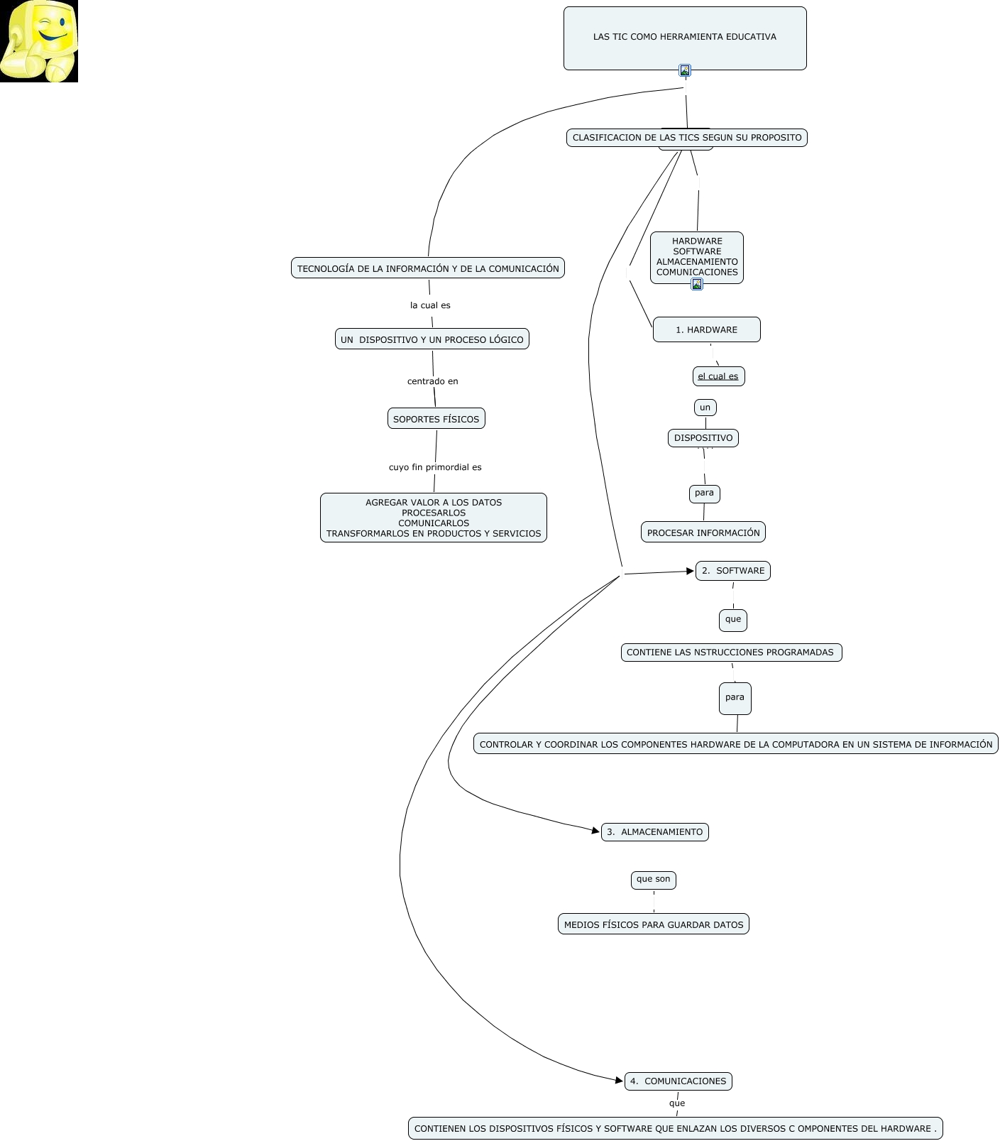 Este Cmap, tiene información relacionada con: LAS TIC, CLASIFICACION DE LAS TICS SEGUN SU PROPOSITO 1. HARDWARE, LAS TIC COMO HERRAMIENTA EDUCATIVA CLASIFICACION DE LAS TICS SEGUN SU PROPOSITO, CONTIENE LAS NSTRUCCIONES PROGRAMADAS para, CLASIFICACION DE LAS TICS SEGUN SU PROPOSITO HARDWARE SOFTWARE ALMACENAMIENTO COMUNICACIONES, TECNOLOGÍA DE LA INFORMACIÓN Y DE LA COMUNICACIÓN la cual es UN DISPOSITIVO Y UN PROCESO LÓGICO, 4. COMUNICACIONES que CONTIENEN LOS DISPOSITIVOS FÍSICOS Y SOFTWARE QUE ENLAZAN LOS DIVERSOS C OMPONENTES DEL HARDWARE ., LAS TIC COMO HERRAMIENTA EDUCATIVA TECNOLOGÍA DE LA INFORMACIÓN Y DE LA COMUNICACIÓN, UN DISPOSITIVO Y UN PROCESO LÓGICO centrado en SOPORTES FÍSICOS, 1. HARDWARE el cual es, 3. ALMACENAMIENTO, DISPOSITIVO para, SOPORTES FÍSICOS cuyo fin primordial es AGREGAR VALOR A LOS DATOS PROCESARLOS COMUNICARLOS TRANSFORMARLOS EN PRODUCTOS Y SERVICIOS, un ???? DISPOSITIVO, 2. SOFTWARE que, 2. SOFTWARE, que son MEDIOS FÍSICOS PARA GUARDAR DATOS, para ???? PROCESAR INFORMACIÓN, UN DISPOSITIVO Y UN PROCESO LÓGICO centrado en SOPORTES FÍSICOS, 4. COMUNICACIONES, para ???? CONTROLAR Y COORDINAR LOS COMPONENTES HARDWARE DE LA COMPUTADORA EN UN SISTEMA DE INFORMACIÓN