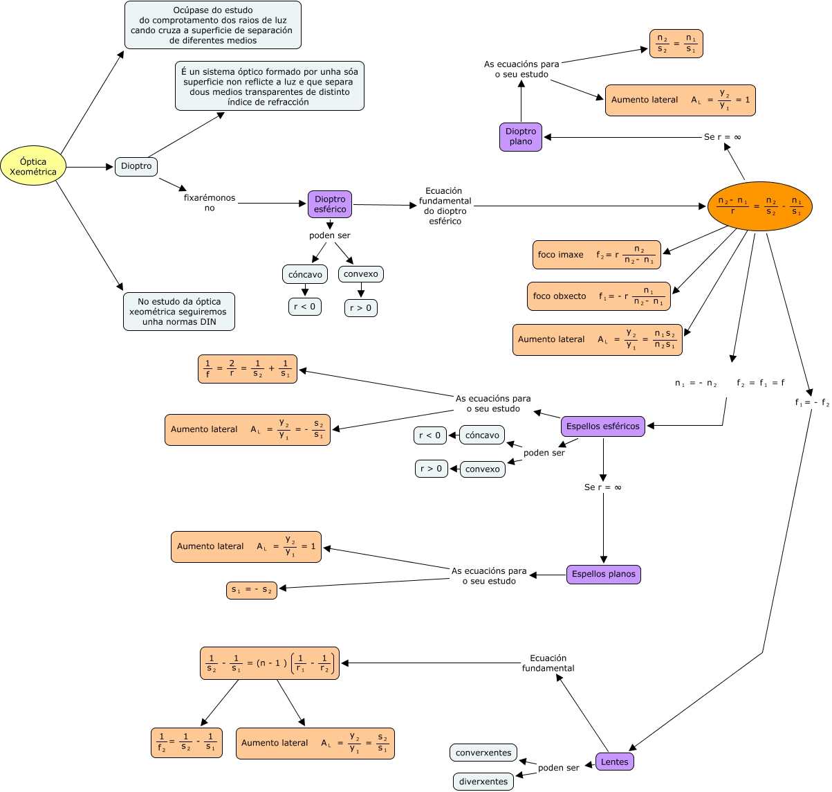 Este mapa conceptual ten información relativa a: optica2bachf, <math xmlns="http://www.w3.org/1998/Math/MathML"> <mrow> <mfrac> <mrow> <mmultiscripts> <mtext> n </mtext> <mtext> 2 </mtext> <none/> </mmultiscripts> <mtext> - </mtext> <mmultiscripts> <mtext> n </mtext> <mtext> 1 </mtext> <none/> </mmultiscripts> </mrow> <mtext> r </mtext> </mfrac> <mtext> = </mtext> <mfrac> <mmultiscripts> <mtext> n </mtext> <mtext> 2 </mtext> <none/> </mmultiscripts> <mmultiscripts> <mtext> s </mtext> <mtext> 2 </mtext> <none/> </mmultiscripts> </mfrac> <mtext> - </mtext> <mfrac> <mmultiscripts> <mtext> n </mtext> <mtext> 1 </mtext> <none/> </mmultiscripts> <mmultiscripts> <mtext> s </mtext> <mtext> 1 </mtext> <none/> </mmultiscripts> </mfrac> </mrow> </math> Se r = ∞ Dioptro plano, <math xmlns="http://www.w3.org/1998/Math/MathML"> <mrow> <mfrac> <mtext> 1 </mtext> <mmultiscripts> <mtext> s </mtext> <mtext> 2 </mtext> <none/> </mmultiscripts> </mfrac> <mtext> - </mtext> <mfrac> <mtext> 1 </mtext> <mmultiscripts> <mtext> s </mtext> <mtext> 1 </mtext> <none/> </mmultiscripts> </mfrac> <mtext> = (n - 1 ) </mtext> <mfenced open="(" close=")"> <mfrac> <mtext> 1 </mtext> <mmultiscripts> <mtext> r </mtext> <mtext> 1 </mtext> <none/> </mmultiscripts> </mfrac> <mtext> - </mtext> <mfrac> <mtext> 1 </mtext> <mmultiscripts> <mtext> r </mtext> <mtext> 2 </mtext> <none/> </mmultiscripts> </mfrac> </mfenced> </mrow> </math> ???? <math xmlns="http://www.w3.org/1998/Math/MathML"> <mrow> <mtext> Aumento lateral </mtext> <mmultiscripts> <mtext> A </mtext> <mtext> L </mtext> <none/> </mmultiscripts> <mtext> = </mtext> <mfrac> <mmultiscripts> <mtext> y </mtext> <mtext> 2 </mtext> <none/> </mmultiscripts> <mmultiscripts> <mtext> y </mtext> <mtext> 1 </mtext> <none/> </mmultiscripts> </mfrac> <mtext> = </mtext> <mfrac> <mrow> <mmultiscripts> <mtext> s </mtext> <mtext> 2 </mtext> <none/> </mmultiscripts> </mrow> <mrow> <mmultiscripts> <mtext> s </mtext> <mtext> 1 </mtext> <none/> </mmultiscripts> </mrow> </mfrac> </mrow> </math>, Lentes Ecuación fundamental <math xmlns="http://www.w3.org/1998/Math/MathML"> <mrow> <mfrac> <mtext> 1 </mtext> <mmultiscripts> <mtext> s </mtext> <mtext> 2 </mtext> <none/> </mmultiscripts> </mfrac> <mtext> - </mtext> <mfrac> <mtext> 1 </mtext> <mmultiscripts> <mtext> s </mtext> <mtext> 1 </mtext> <none/> </mmultiscripts> </mfrac> <mtext> = (n - 1 ) </mtext> <mfenced open="(" close=")"> <mfrac> <mtext> 1 </mtext> <mmultiscripts> <mtext> r </mtext> <mtext> 1 </mtext> <none/> </mmultiscripts> </mfrac> <mtext> - </mtext> <mfrac> <mtext> 1 </mtext> <mmultiscripts> <mtext> r </mtext> <mtext> 2 </mtext> <none/> </mmultiscripts> </mfrac> </mfenced> </mrow> </math>, Dioptro esférico Ecuación fundamental do dioptro esférico <math xmlns="http://www.w3.org/1998/Math/MathML"> <mrow> <mfrac> <mrow> <mmultiscripts> <mtext> n </mtext> <mtext> 2 </mtext> <none/> </mmultiscripts> <mtext> - </mtext> <mmultiscripts> <mtext> n </mtext> <mtext> 1 </mtext> <none/> </mmultiscripts> </mrow> <mtext> r </mtext> </mfrac> <mtext> = </mtext> <mfrac> <mmultiscripts> <mtext> n </mtext> <mtext> 2 </mtext> <none/> </mmultiscripts> <mmultiscripts> <mtext> s </mtext> <mtext> 2 </mtext> <none/> </mmultiscripts> </mfrac> <mtext> - </mtext> <mfrac> <mmultiscripts> <mtext> n </mtext> <mtext> 1 </mtext> <none/> </mmultiscripts> <mmultiscripts> <mtext> s </mtext> <mtext> 1 </mtext> <none/> </mmultiscripts> </mfrac> </mrow> </math>, Espellos planos As ecuacións para o seu estudo <math xmlns="http://www.w3.org/1998/Math/MathML"> <mmultiscripts> <mtext> s </mtext> <mtext> 1 </mtext> <none/> </mmultiscripts> <mtext> = - </mtext> <mmultiscripts> <mtext> s </mtext> <mtext> 2 </mtext> <none/> </mmultiscripts> </math>, <math xmlns="http://www.w3.org/1998/Math/MathML"> <mrow> <mfrac> <mrow> <mmultiscripts> <mtext> n </mtext> <mtext> 2 </mtext> <none/> </mmultiscripts> <mtext> - </mtext> <mmultiscripts> <mtext> n </mtext> <mtext> 1 </mtext> <none/> </mmultiscripts> </mrow> <mtext> r </mtext> </mfrac> <mtext> = </mtext> <mfrac> <mmultiscripts> <mtext> n </mtext> <mtext> 2 </mtext> <none/> </mmultiscripts> <mmultiscripts> <mtext> s </mtext> <mtext> 2 </mtext> <none/> </mmultiscripts> </mfrac> <mtext> - </mtext> <mfrac> <mmultiscripts> <mtext> n </mtext> <mtext> 1 </mtext> <none/> </mmultiscripts> <mmultiscripts> <mtext> s </mtext> <mtext> 1 </mtext> <none/> </mmultiscripts> </mfrac> </mrow> </math> ???? <math xmlns="http://www.w3.org/1998/Math/MathML"> <mrow> <mtext> foco imaxe </mtext> <mmultiscripts> <mtext> f </mtext> <mtext> 2 </mtext> <none/> </mmultiscripts> <mtext> = r </mtext> <mfrac> <mmultiscripts> <mtext> n </mtext> <mtext> 2 </mtext> <none/> </mmultiscripts> <mrow> <mmultiscripts> <mtext> n </mtext> <mtext> 2 </mtext> <none/> </mmultiscripts> <mtext> - </mtext> <mmultiscripts> <mtext> n </mtext> <mtext> 1 </mtext> <none/> </mmultiscripts> </mrow> </mfrac> </mrow> </math>, Lentes poden ser diverxentes, convexo ???? r > 0, Espellos esféricos poden ser cóncavo, <math xmlns="http://www.w3.org/1998/Math/MathML"> <mrow> <mfrac> <mrow> <mmultiscripts> <mtext> n </mtext> <mtext> 2 </mtext> <none/> </mmultiscripts> <mtext> - </mtext> <mmultiscripts> <mtext> n </mtext> <mtext> 1 </mtext> <none/> </mmultiscripts> </mrow> <mtext> r </mtext> </mfrac> <mtext> = </mtext> <mfrac> <mmultiscripts> <mtext> n </mtext> <mtext> 2 </mtext> <none/> </mmultiscripts> <mmultiscripts> <mtext> s </mtext> <mtext> 2 </mtext> <none/> </mmultiscripts> </mfrac> <mtext> - </mtext> <mfrac> <mmultiscripts> <mtext> n </mtext> <mtext> 1 </mtext> <none/> </mmultiscripts> <mmultiscripts> <mtext> s </mtext> <mtext> 1 </mtext> <none/> </mmultiscripts> </mfrac> </mrow> </math> ???? <math xmlns="http://www.w3.org/1998/Math/MathML"> <mrow> <mtext> foco obxecto </mtext> <mmultiscripts> <mtext> f </mtext> <mtext> 1 </mtext> <none/> </mmultiscripts> <mtext> = - r </mtext> <mfrac> <mmultiscripts> <mtext> n </mtext> <mtext> 1 </mtext> <none/> </mmultiscripts> <mrow> <mmultiscripts> 