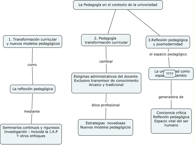 Este Cmap, tiene información relacionada con: pedagogía, 2. Pedagogía transformación curricular cambiar Estigmas administrativos del docente Exclusivo transmisor de conocimiento Arcaico y tradicional, La Pedagogía en el contexto de la universidad ???? 2. Pedagogía transformación curricular, 3.Reflexión pedagógica y posmodernidad el espacio pedagógico ????, 1. Transformación curricular y nuevos modelos pedagógicos como La reflexión pedagógica, La universidad como espacio de cambio generadora de Conciencia crítica Reflexión pedagógica Espacio vital del ser humano, Estigmas administrativos del docente Exclusivo transmisor de conocimiento Arcaico y tradicional ética profesional Estrategias novedosas Nuevos modelos pedagógicos, La reflexión pedagógica mediante Seminarios continuos y rigurosos Investigación : incluida la I.A.P Y otros enfoques, La Pedagogía en el contexto de la universidad ???? 3.Reflexión pedagógica y posmodernidad