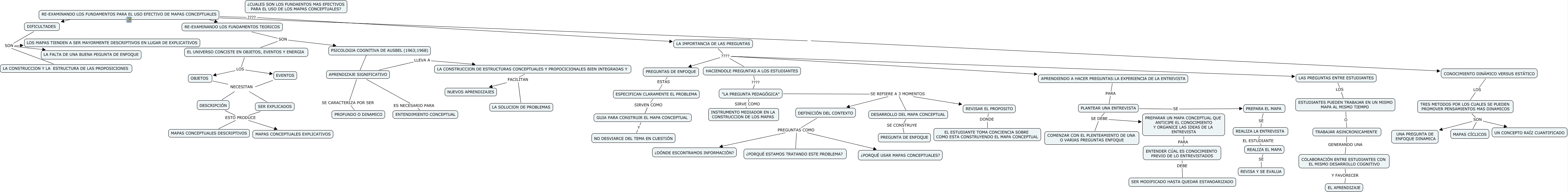 Este Cmap, tiene información relacionada con: RE-EXAMINANDO LOS FUNDAMENTOS PARA EL USO EFECTIVO DE LOS MAPAS CONCEPTUALES, LA CONSTRUCCION DE ESTRUCTURAS CONCEPTUALES Y PROPOCICIONALES BIEN INTEGRADAS Y FACILITAN NUEVOS APRENDIZAJES, LA IMPORTANCIA DE LAS PREGUNTAS ???? HACIENDOLE PREGUNTAS A LOS ESTUDIANTES, APRENDIZAJE SIGNIFICATIVO LLEVA A LA CONSTRUCCION DE ESTRUCTURAS CONCEPTUALES Y PROPOCICIONALES BIEN INTEGRADAS Y, DIFICULTADES SON LA FALTA DE UNA BUENA PEGUNTA DE ENFOQUE, RE-EXAMINANDO LOS FUNDAMENTOS PARA EL USO EFECTIVO DE MAPAS CONCEPTUALES CONOCIMIENTO DINÁMICO VERSUS ESTÁTICO, OBJETOS NECESITAN SER EXPLICADOS, PREGUNTAS DE ENFOQUE ESTAS ESPECIFICAN CLARAMENTE EL PROBLEMA, EVENTOS NECESITAN SER EXPLICADOS, DIFICULTADES SON LOS MAPAS TIENDEN A SER MAYORMENTE DESCRIPTIVOS EN LUGAR DE EXPLICATIVOS, COLABORACIÓN ENTRE ESTUDIANTES CON EL MISMO DESARROLLO COGNITIVO Y FAVORECER EL APRENDIZAJE, LA CONSTRUCCION DE ESTRUCTURAS CONCEPTUALES Y PROPOCICIONALES BIEN INTEGRADAS Y FACILITAN LA SOLUCION DE PROBLEMAS, CONOCIMIENTO DINÁMICO VERSUS ESTÁTICO LOS TRES METODOS POR LOS CUALES SE PUEDEN PROMOVER PENSAMIENTOS MAS DINAMICOS, PREPARA EL MAPA SE REALIZA LA ENTREVISTA, PLANTEAR UNA ENTREVISTA SE PREPARA EL MAPA, TRES METODOS POR LOS CUALES SE PUEDEN PROMOVER PENSAMIENTOS MAS DINAMICOS SON MAPAS CÍCLICOS, "LA PREGUNTA PEDAGÓGICA" SE REFIERE A 3 MOMENTOS DEFINICIÓN DEL CONTEXTO, "LA PREGUNTA PEDAGÓGICA" SIRVE COMO INSTRUMENTO MEDIADOR EN LA CONSTRUCCION DE LOS MAPAS, APRENDIENDO A HACER PREGUNTAS:LA EXPERIENCIA DE LA ENTREVISTA PARA PLANTEAR UNA ENTREVISTA, EVENTOS NECESITAN DESCRIPCIÓN, REVISAR EL PROPOSITO DONDE EL ESTUDIANTE TOMA CONCIENCIA SOBRE COMO ESTA CONSTRUYENDO EL MAPA CONCEPTUAL