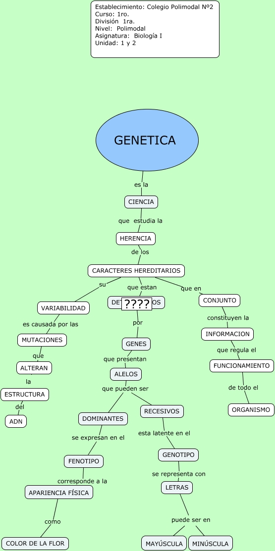 Esse mapa conceitual, produzido no IHMC CmapTools, tem a informação relacionada a: GENETICA, ESTRUCTURA del ADN, MUTACIONES que ALTERAN, CONJUNTO constituyen la INFORMACION, DOMINANTES se expresan en el FENOTIPO, LETRAS puede ser en MAYÚSCULA, APARIENCIA FÍSICA como COLOR DE LA FLOR, GENOTIPO se representa con LETRAS, DETERMINADOS por GENES, CARACTERES HEREDITARIOS su VARIABILIDAD, INFORMACION que regula el FUNCIONAMIENTO, CIENCIA que estudia la HERENCIA, LETRAS puede ser en MINÚSCULA, VARIABILIDAD es causada por las MUTACIONES, GENES que presentan ALELOS, GENETICA es la CIENCIA, HERENCIA de los CARACTERES HEREDITARIOS, FENOTIPO corresponde a la APARIENCIA FÍSICA, RECESIVOS esta latente en el GENOTIPO, FUNCIONAMIENTO de todo el ORGANISMO, ALELOS que pueden ser DOMINANTES