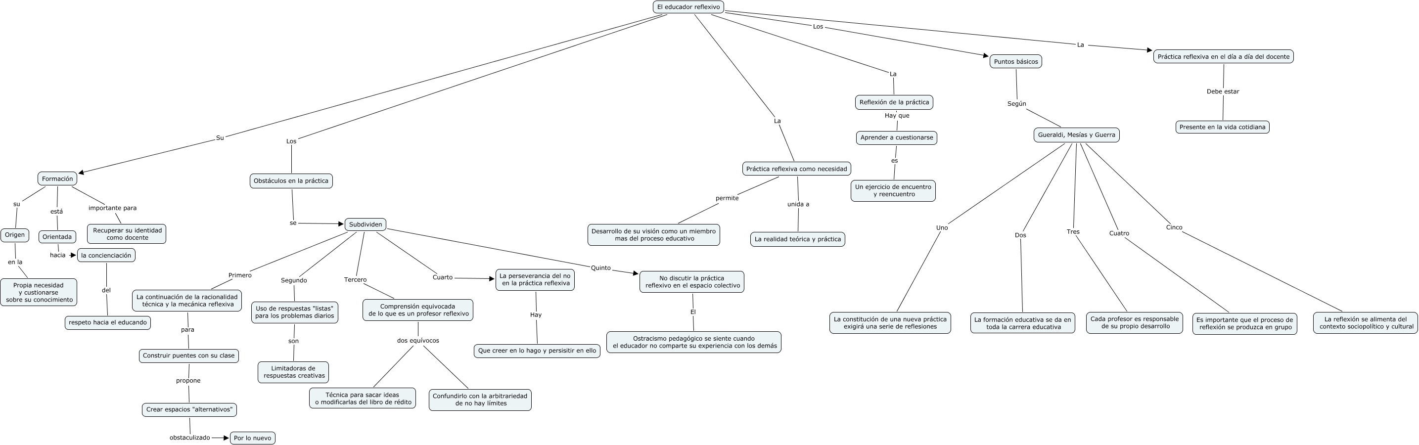 Este Cmap, tiene información relacionada con: El educador reflexivo paula.cmap, Origen en la Propia necesidad y custionarse sobre su conocimiento, Gueraldi, Mesías y Guerra Tres Cada profesor es responsable de su propio desarrollo, Práctica reflexiva en el día a día del docente Debe estar Presente en la vida cotidiana, Práctica reflexiva como necesidad permite Desarrollo de su visión como un miembro mas del proceso educativo, Subdividen Segundo Uso de respuestas "listas" para los problemas diarios, Construir puentes con su clase propone Crear espacios "alternativos", Puntos básicos Según Gueraldi, Mesías y Guerra, Gueraldi, Mesías y Guerra Cinco La reflexión se alimenta del contexto sociopolítico y cultural, Uso de respuestas "listas" para los problemas diarios son Limitadoras de respuestas creativas, Formación su Origen, El educador reflexivo La Práctica reflexiva como necesidad, Reflexión de la práctica Hay que Aprender a cuestionarse, Práctica reflexiva como necesidad unida a La realidad teórica y práctica, Comprensión equivocada de lo que es un profesor reflexivo dos equívocos Confundirlo con la arbitrariedad de no hay límites, El educador reflexivo La Reflexión de la práctica, Formación está Orientada, Subdividen Tercero Comprensión equivocada de lo que es un profesor reflexivo, Obstáculos en la práctica se Subdividen, El educador reflexivo Su Formación, Subdividen Quinto No discutir la práctica reflexivo en el espacio colectivo