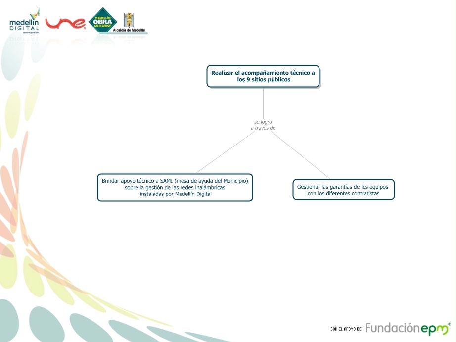 Este Cmap, tiene información relacionada con: Gobierno-Entregables 5, Realizar el acompañamiento técnico a los 9 sitios públicos se logra a través de Brindar apoyo técnico a SAMI (mesa de ayuda del Municipio) sobre la gestión de las redes inalámbricas instaladas por Medellín Digital, Realizar el acompañamiento técnico a los 9 sitios públicos se logra a través de Gestionar las garantías de los equipos con los diferentes contratistas