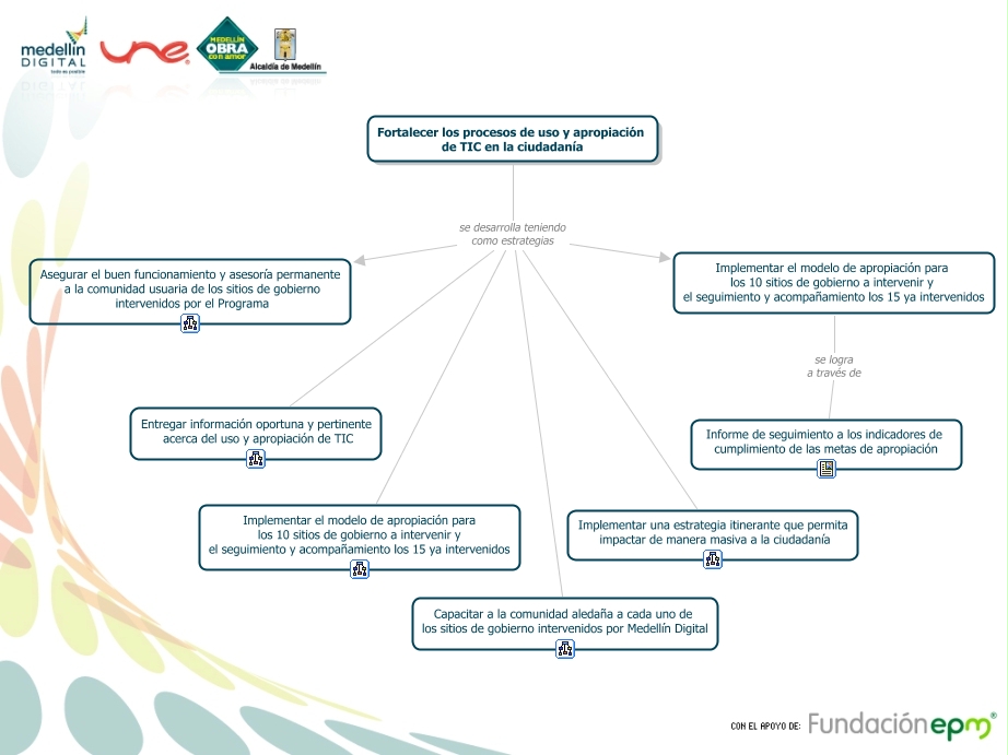 Este Cmap, tiene información relacionada con: Gobierno-Objetivo 2, Fortalecer los procesos de uso y apropiación de TIC en la ciudadanía se desarrolla teniendo como estrategias Capacitar a la comunidad aledaña a cada uno de los sitios de gobierno intervenidos por Medellín Digital, Fortalecer los procesos de uso y apropiación de TIC en la ciudadanía se desarrolla teniendo como estrategias Implementar el modelo de apropiación para los 10 sitios de gobierno a intervenir y el seguimiento y acompañamiento los 15 ya intervenidos, Fortalecer los procesos de uso y apropiación de TIC en la ciudadanía se desarrolla teniendo como estrategias Entregar información oportuna y pertinente acerca del uso y apropiación de TIC, Fortalecer los procesos de uso y apropiación de TIC en la ciudadanía se desarrolla teniendo como estrategias Implementar el modelo de apropiación para los 10 sitios de gobierno a intervenir y el seguimiento y acompañamiento los 15 ya intervenidos, Fortalecer los procesos de uso y apropiación de TIC en la ciudadanía se desarrolla teniendo como estrategias Asegurar el buen funcionamiento y asesoría permanente a la comunidad usuaria de los sitios de gobierno intervenidos por el Programa, Implementar el modelo de apropiación para los 10 sitios de gobierno a intervenir y el seguimiento y acompañamiento los 15 ya intervenidos se logra a través de Informe de seguimiento a los indicadores de cumplimiento de las metas de apropiación, Fortalecer los procesos de uso y apropiación de TIC en la ciudadanía se desarrolla teniendo como estrategias Implementar una estrategia itinerante que permita impactar de manera masiva a la ciudadanía