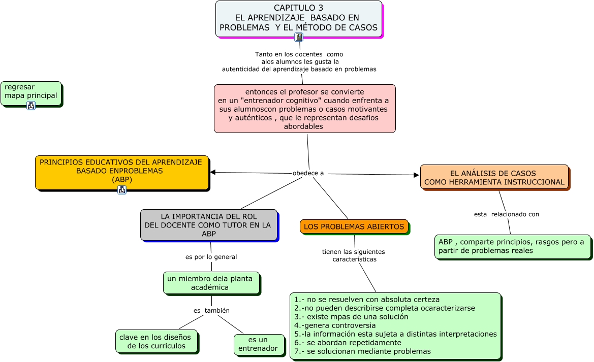 Este Cmap, tiene información relacionada con: CAPITULO 3, un miembro dela planta académica es también clave en los diseños de los curriculos, entonces el profesor se convierte en un "entrenador cognitivo" cuando enfrenta a sus alumnoscon problemas o casos motivantes y auténticos , que le representan desafios abordables obedece a LOS PROBLEMAS ABIERTOS, un miembro dela planta académica es también es un entrenador, EL ANÁLISIS DE CASOS COMO HERRAMIENTA INSTRUCCIONAL esta relacionado con ABP , comparte principios, rasgos pero a partir de problemas reales, entonces el profesor se convierte en un "entrenador cognitivo" cuando enfrenta a sus alumnoscon problemas o casos motivantes y auténticos , que le representan desafios abordables obedece a PRINCIPIOS EDUCATIVOS DEL APRENDIZAJE BASADO ENPROBLEMAS (ABP), entonces el profesor se convierte en un "entrenador cognitivo" cuando enfrenta a sus alumnoscon problemas o casos motivantes y auténticos , que le representan desafios abordables obedece a LA IMPORTANCIA DEL ROL DEL DOCENTE COMO TUTOR EN LA ABP, LOS PROBLEMAS ABIERTOS tienen las siguientes características 1.- no se resuelven con absoluta certeza 2.-no pueden describirse completa ocaracterizarse 3.- existe mpas de una solución 4.-genera controversia 5.-la información esta sujeta a distintas interpretaciones 6.- se abordan repetidamente 7.- se solucionan mediante problemas, entonces el profesor se convierte en un "entrenador cognitivo" cuando enfrenta a sus alumnoscon problemas o casos motivantes y auténticos , que le representan desafios abordables obedece a EL ANÁLISIS DE CASOS COMO HERRAMIENTA INSTRUCCIONAL, CAPITULO 3 EL APRENDIZAJE BASADO EN PROBLEMAS Y EL MÉTODO DE CASOS Tanto en los docentes como alos alumnos les gusta la autenticidad del aprendizaje basado en problemas entonces el profesor se convierte en un "entrenador cognitivo" cuando enfrenta a sus alumnoscon problemas o casos motivantes y auténticos , que le representan desafios abordables, LA IMPORTANCIA DEL ROL DEL DOCENTE COMO TUTOR EN LA ABP es por lo general un miembro dela planta académica