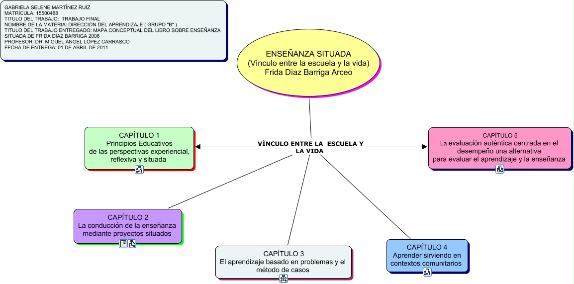 Este Cmap, tiene información relacionada con: MAPA PRINCIPAL, ENSEÑANZA SITUADA (Vínculo entre la escuela y la vida) Frida Díaz Barriga Arceo VÍNCULO ENTRE LA ESCUELA Y LA VIDA CAPÍTULO 1 Principios Educativos de las perspectivas experiencial, reflexiva y situada, ENSEÑANZA SITUADA (Vínculo entre la escuela y la vida) Frida Díaz Barriga Arceo VÍNCULO ENTRE LA ESCUELA Y LA VIDA CAPÍTULO 4 Aprender sirviendo en contextos comunitarios, ENSEÑANZA SITUADA (Vínculo entre la escuela y la vida) Frida Díaz Barriga Arceo VÍNCULO ENTRE LA ESCUELA Y LA VIDA CAPÍTULO 3 El aprendizaje basado en problemas y el método de casos, ENSEÑANZA SITUADA (Vínculo entre la escuela y la vida) Frida Díaz Barriga Arceo VÍNCULO ENTRE LA ESCUELA Y LA VIDA CAPÍTULO 2 La conducción de la enseñanza mediante proyectos situados, ENSEÑANZA SITUADA (Vínculo entre la escuela y la vida) Frida Díaz Barriga Arceo VÍNCULO ENTRE LA ESCUELA Y LA VIDA CAPÍTULO 5 La evaluación auténtica centrada en el desempeño una alternativa para evaluar el aprendizaje y la enseñanza