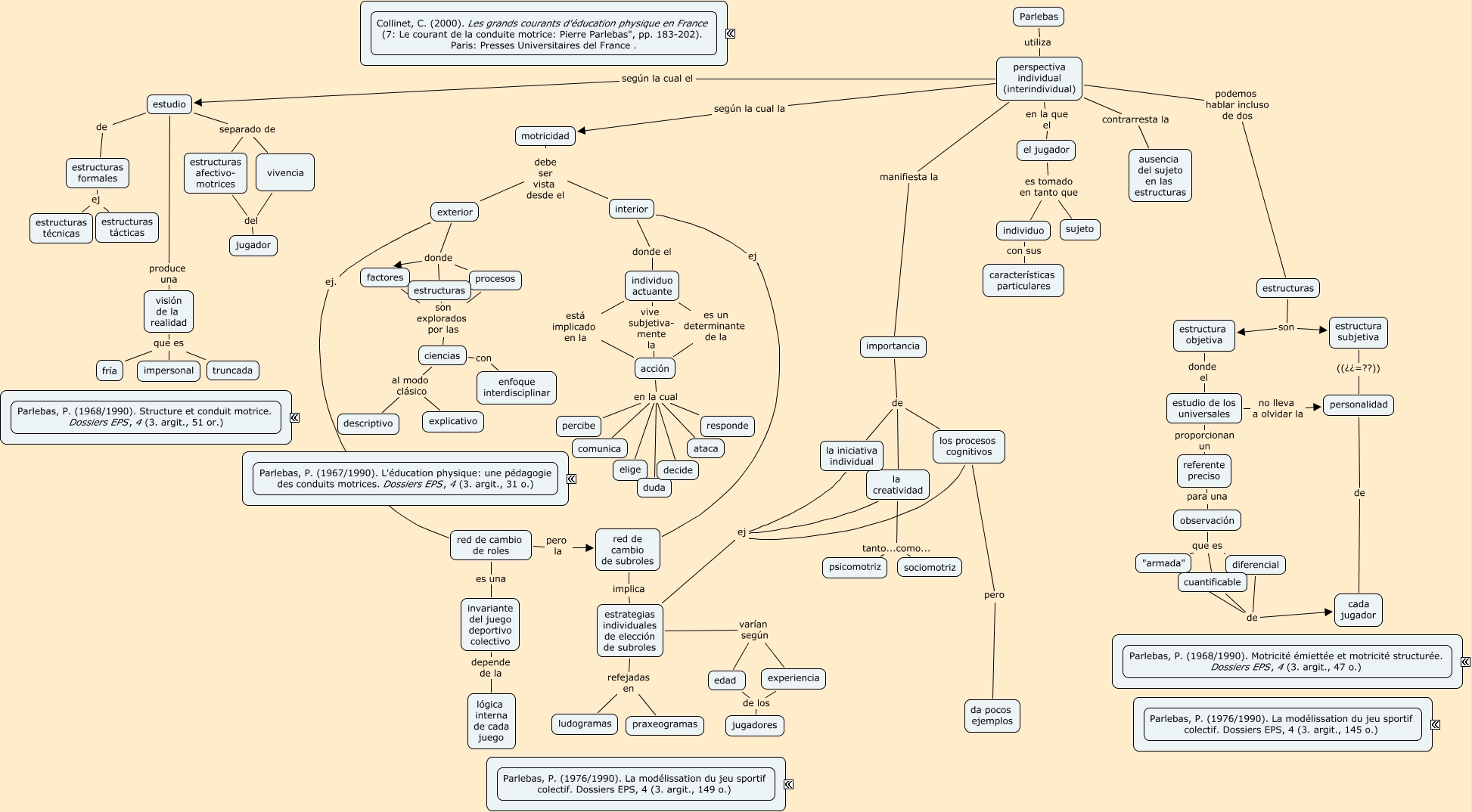 Este Cmap, tiene información relacionada con: Parlebas posición respecto al sujeto, estrategias individuales de elección de subroles refejadas en ludogramas, acción en la cual responde, importancia de la iniciativa individual, estudio separado de estructuras afectivo- motrices, motricidad debe ser vista desde el exterior, interior donde el individuo actuante, los procesos cognitivos pero da pocos ejemplos, la creatividad ej estrategias individuales de elección de subroles, edad de los jugadores, experiencia de los jugadores, perspectiva individual (interindividual) manifiesta la importancia, la iniciativa individual ej estrategias individuales de elección de subroles, visión de la realidad que es truncada, individuo actuante es un determinante de la acción, exterior donde estructuras, la creatividad tanto...como... sociomotriz, exterior donde factores, red de cambio de roles pero la red de cambio de subroles, acción en la cual comunica, estructuras son estructura subjetiva