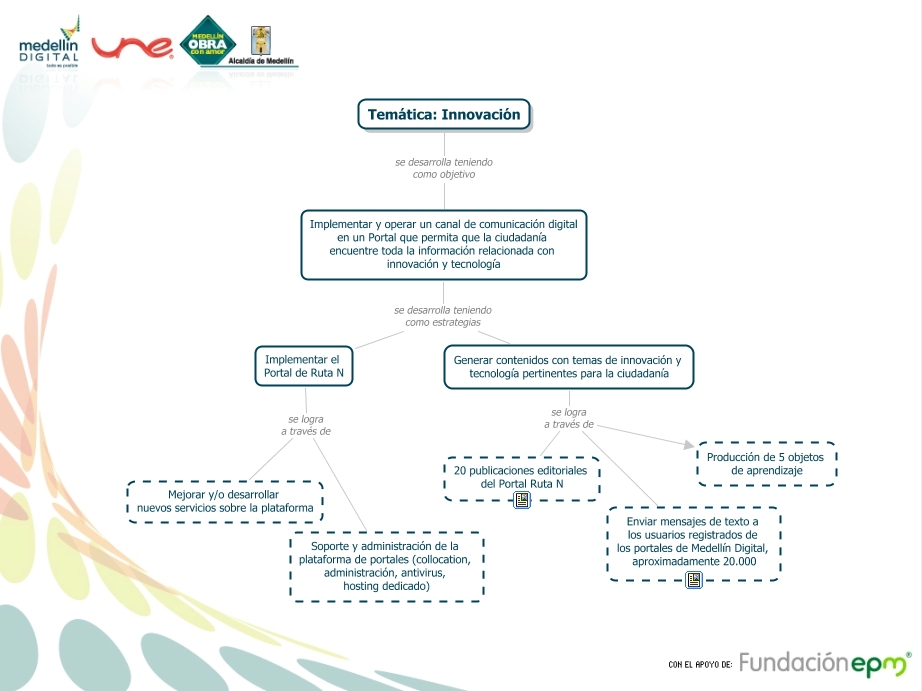 Este Cmap, tiene información relacionada con: Tematica Innovación, Implementar el Portal de Ruta N se logra a través de Mejorar y/o desarrollar nuevos servicios sobre la plataforma, Implementar y operar un canal de comunicación digital en un Portal que permita que la ciudadanía encuentre toda la información relacionada con innovación y tecnología se desarrolla teniendo como estrategias Implementar el Portal de Ruta N, Implementar el Portal de Ruta N se logra a través de Soporte y administración de la plataforma de portales (collocation, administración, antivirus, hosting dedicado), Temática: Innovación se desarrolla teniendo como objetivo Implementar y operar un canal de comunicación digital en un Portal que permita que la ciudadanía encuentre toda la información relacionada con innovación y tecnología, Generar contenidos con temas de innovación y tecnología pertinentes para la ciudadanía se logra a través de Enviar mensajes de texto a los usuarios registrados de los portales de Medellín Digital, aproximadamente 20.000, Generar contenidos con temas de innovación y tecnología pertinentes para la ciudadanía se logra a través de 20 publicaciones editoriales del Portal Ruta N, Implementar y operar un canal de comunicación digital en un Portal que permita que la ciudadanía encuentre toda la información relacionada con innovación y tecnología se desarrolla teniendo como estrategias Generar contenidos con temas de innovación y tecnología pertinentes para la ciudadanía, Generar contenidos con temas de innovación y tecnología pertinentes para la ciudadanía se logra a través de Producción de 5 objetos de aprendizaje