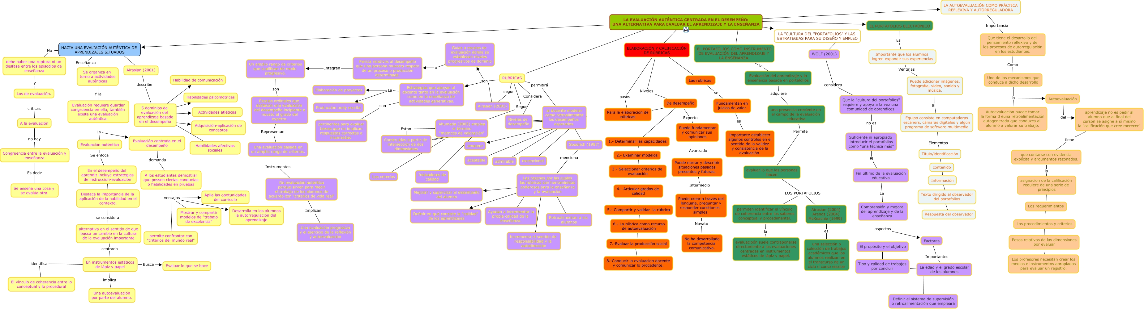 Este Cmap, tiene información relacionada con: Capitulo 5, ELABORACIÓN Y CALIFICACIÓN DE RÚBRICAS pasos Para la elaboracion de rúbricas, Comprensión y mejora del aprendizaje y de la enseñanza. aspectos Factores, Uno de los mecanismos que conduce a dicho desarrollo la Autoevaluación, Puede fundamentar y comunicar sus opiniones Avanzado Puede narrar y describir situaciones pasadas presentes y futuras., Fundamentan en juicios de valor es importante establecer algunos controles en el sentido de la validez y consistencia de la evaluación., Evaluación auténtica Se enfoca En el desempeño del aprendiz incluye estrategias de instruccion-evaluación, Puede adicionar imágenes, fotografía, video, sonido y música. El Equipo consiste en computadoras escáners, cámaras digitales y algún programa de software multimedia, Los procedimientos y criterios ???? Pesos relativos de las dimensiones por evaluar, Que tiene el desarrollo del pensamiento reflexivo y de los procesos de autorregulación en los estudiantes. Como Uno de los mecanismos que conduce a dicho desarrollo, Tipo y calidad de trabajos por concluir ???? Definir el sistema de supervisión o retroalimentación que empleará, LA EVALUACIÓN AUTÉNTICA CENTRADA EN EL DESEMPEÑO: UNA ALTERNATIVA PARA EVALUAR EL APRENDIZAJE Y LA ENSEÑANZA ???? EL PORTAFOLIOS COMO INSTRUMENTO DE EVALUACIÓN DEL APRENDIZAJE Y LA ENSEÑANZA., 6.- La rúbrica como recurso de autoevaluación ???? 7.-Evaluar la producción social, Las razones por las cuales las rúbricas son herramientas poderosas para la enseñanza y la evaluación ???? Ayudan a incrementar la propia calidad de la enseñanza., El propósito y el objetivo ???? Tipo y calidad de trabajos por concluir, LA EVALUACIÓN AUTÉNTICA CENTRADA EN EL DESEMPEÑO: UNA ALTERNATIVA PARA EVALUAR EL APRENDIZAJE Y LA ENSEÑANZA ???? LA AUTOEVALUACIÓN COMO PRÁCTICA REFLEXIVA Y AUTORREGULADORA, RUBRICAS son Estrategias que apoyan al docente tanto en la evaluación como en la enseñanza de actividades generativas., En el desempeño del aprendiz incluye estrategias de instruccion-evaluación ???? Destaca la importancia de la aplicación de la habilidad en el contexto., LA EVALUACIÓN AUTÉNTICA CENTRADA EN EL DESEMPEÑO: UNA ALTERNATIVA PARA EVALUAR EL APRENDIZAJE Y LA ENSEÑANZA ???? EL PORTAFOLIOS ELECTRÓNICO, Los requerimientos ???? Los procedimientos y criterios, asignacion de la calificación requiere de una serie de principios ???? Los requerimientos