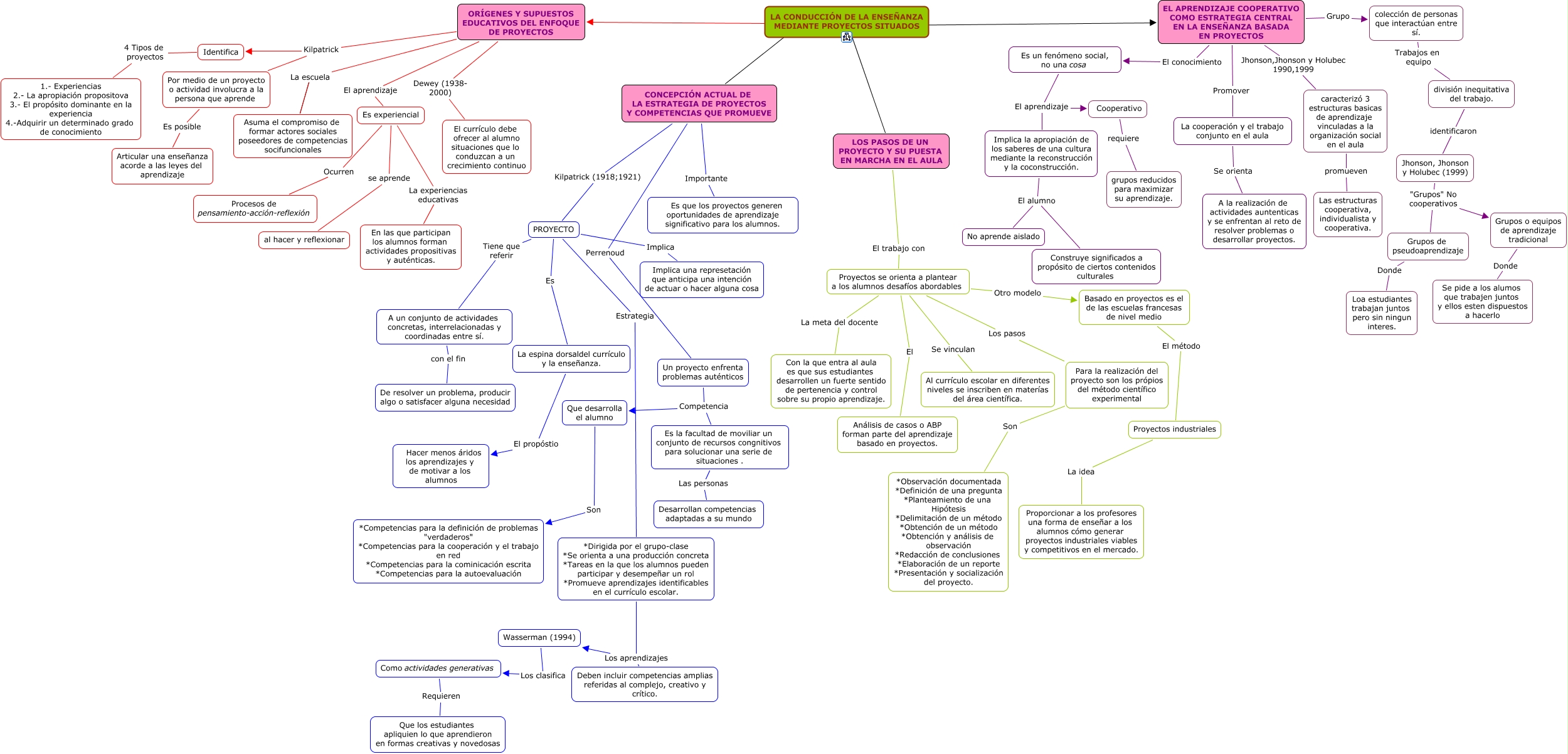 Este Cmap, tiene información relacionada con: tema 3, colección de personas que interactúan entre sí. Trabajos en equipo división inequitativa del trabajo., Un proyecto enfrenta problemas auténticos Competencia Que desarrolla el alumno, Jhonson, Jhonson y Holubec (1999) "Grupos" No cooperativos Grupos o equipos de aprendizaje tradicional, PROYECTO Implica Implica una represetación que anticipa una intención de actuar o hacer alguna cosa, Un proyecto enfrenta problemas auténticos Competencia Es la facultad de moviliar un conjunto de recursos congnitivos para solucionar una serie de situaciones ., LA CONDUCCIÓN DE LA ENSEÑANZA MEDIANTE PROYECTOS SITUADOS Subtema 1 ORÍGENES Y SUPUESTOS EDUCATIVOS DEL ENFOQUE DE PROYECTOS, Proyectos se orienta a plantear a los alumnos desafíos abordables El Análisis de casos o ABP forman parte del aprendizaje basado en proyectos., Por medio de un proyecto o actividad involucra a la persona que aprende Es posible Articular una enseñanza acorde a las leyes del aprendizaje, EL APRENDIZAJE COOPERATIVO COMO ESTRATEGIA CENTRAL EN LA ENSEÑANZA BASADA EN PROYECTOS Grupo colección de personas que interactúan entre sí., CONCEPCIÓN ACTUAL DE LA ESTRATEGIA DE PROYECTOS Y COMPETENCIAS QUE PROMUEVE Kilpatrick (1918;1921) PROYECTO, ORÍGENES Y SUPUESTOS EDUCATIVOS DEL ENFOQUE DE PROYECTOS La escuela Asuma el compromiso de formar actores sociales poseedores de competencias socifuncionales, PROYECTO Tiene que referir A un conjunto de actividades concretas, interrelacionadas y coordinadas entre sí., CONCEPCIÓN ACTUAL DE LA ESTRATEGIA DE PROYECTOS Y COMPETENCIAS QUE PROMUEVE Perrenoud Un proyecto enfrenta problemas auténticos, EL APRENDIZAJE COOPERATIVO COMO ESTRATEGIA CENTRAL EN LA ENSEÑANZA BASADA EN PROYECTOS Jhonson,Jhonson y Holubec 1990,1999 caracterizó 3 estructuras basicas de aprendizaje vinculadas a la organización social en el aula, Proyectos se orienta a plantear a los alumnos desafíos abordables Los pasos Para la realización del proyecto son los própios del método científico experimental, ORÍGENES Y SUPUESTOS EDUCATIVOS DEL ENFOQUE DE PROYECTOS La escuela Asuma el compromiso de formar actores sociales poseedores de competencias socifuncionales, ORÍGENES Y SUPUESTOS EDUCATIVOS DEL ENFOQUE DE PROYECTOS El aprendizaje Es experiencial, La cooperación y el trabajo conjunto en el aula Se orienta A la realización de actividades auntenticas y se enfrentan al reto de resolver problemas o desarrollar proyectos., ORÍGENES Y SUPUESTOS EDUCATIVOS DEL ENFOQUE DE PROYECTOS Kilpatrick Identifica, Wasserman (1994) Los clasifica Como actividades generativas