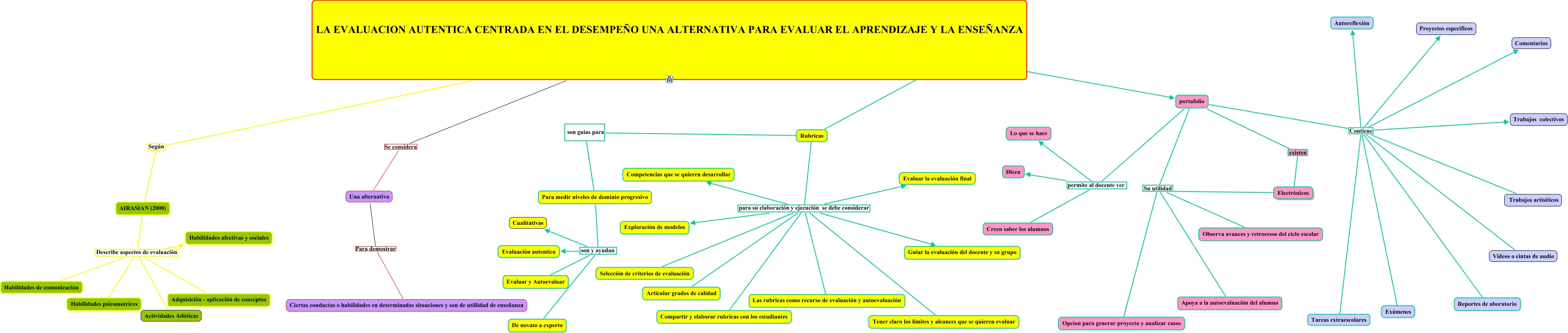 Este Cmap, tiene información relacionada con: LA EVALUACION AUTENTICA CENTRADA EN EL DESEMPEÑO,UNA ALTERNATIVA PARA EVALUAR EL APRENDIZAJE Y LA ENSEÑANZA, Rubricas para su elaboración y ejecución se debe considerar Tener claro los limites y alcances que se quieren evaluar, Electrónicos Su utilidad Observa avances y retrocesos del ciclo escolar, Rubricas para su elaboración y ejecución se debe considerar Compartir y elaborar rubricas con los estudiantes, portafolio Contiene Trabajos artisiticos, portafolio Su utilidad Opcion para generar proyecto y analizar casos, LA EVALUACION AUTENTICA CENTRADA EN EL DESEMPEÑO UNA ALTERNATIVA PARA EVALUAR EL APRENDIZAJE Y LA ENSEÑANZA Se considera Una alternativa, Una alternativa Para demostrar Ciertas conductas o habilidades en determinadas situaciones y son de utillidad de enseñanza, portafolio permite al docente ver Dicen, Rubricas son guias para Para medir niveles de dominio progresivo, Rubricas para su elaboración y ejecución se debe considerar Articular grados de calidad, portafolio permite al docente ver Creen saber los alumnos, Rubricas para su elaboración y ejecución se debe considerar Guiar la evaluación del docente y su grupo, AIRASIAN (2000) Describe aspectos de evaluación Adquisición - aplicación de conceptos, Rubricas para su elaboración y ejecución se debe considerar Evaluar la evaluación final, portafolio Contiene Tareas extraescolares, portafolio Contiene Videos o cintas de audio, portafolio permite al docente ver Lo que se hace, portafolio Contiene Proyectos especificos, Rubricas para su elaboración y ejecución se debe considerar Exploración de modelos, Para medir niveles de dominio progresivo son y ayudan Cualitativas