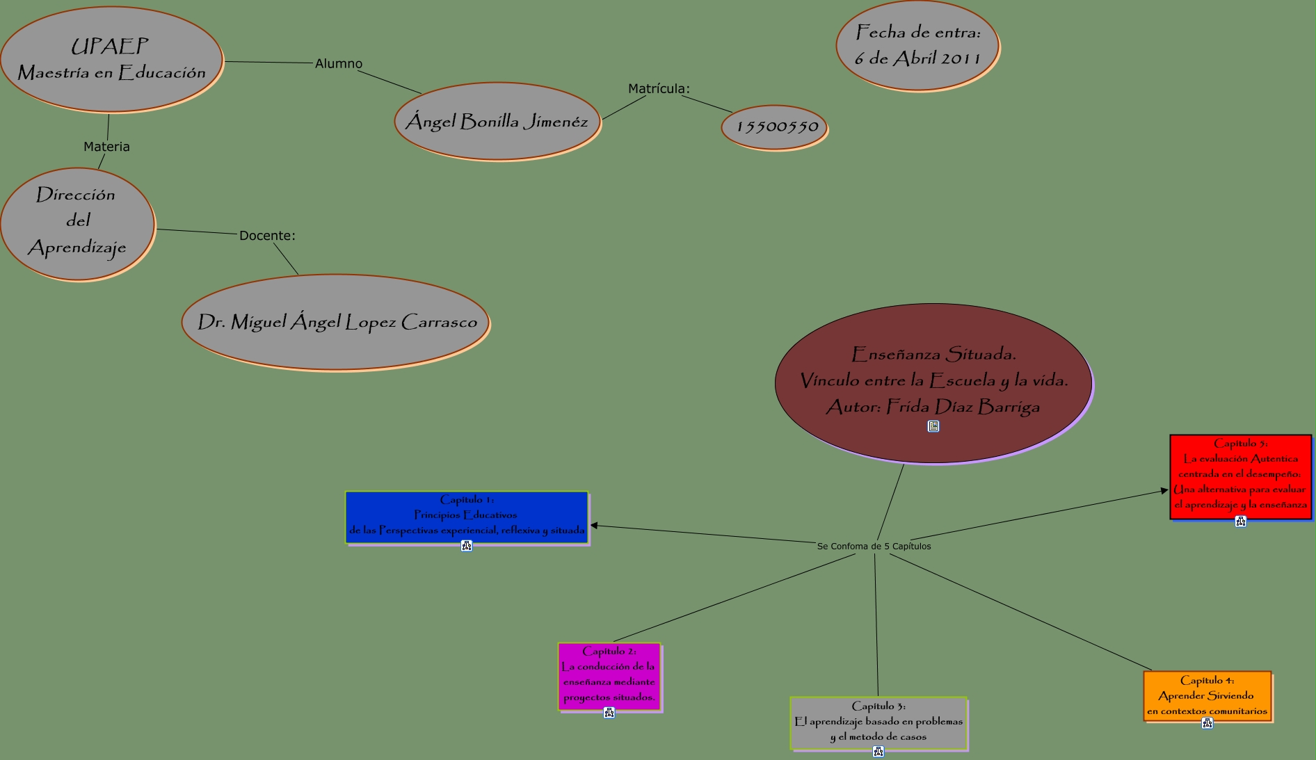 Este Cmap, tiene información relacionada con: Mapa Principal, Enseñanza Situada. Vínculo entre la Escuela y la vida. Autor: Frida Díaz Barriga Se Confoma de 5 Capítulos Capítulo 4: Aprender Sirviendo en contextos comunitarios, Enseñanza Situada. Vínculo entre la Escuela y la vida. Autor: Frida Díaz Barriga Se Confoma de 5 Capítulos Capítulo 3: El aprendizaje basado en problemas y el metodo de casos, Ángel Bonilla Jimenéz Matrícula: 15500550, Enseñanza Situada. Vínculo entre la Escuela y la vida. Autor: Frida Díaz Barriga Se Confoma de 5 Capítulos Capítulo 2: La conducción de la enseñanza mediante proyectos situados., Enseñanza Situada. Vínculo entre la Escuela y la vida. Autor: Frida Díaz Barriga Se Confoma de 5 Capítulos Capítulo 1: Principios Educativos de las Perspectivas experiencial, reflexiva y situada, Enseñanza Situada. Vínculo entre la Escuela y la vida. Autor: Frida Díaz Barriga Se Confoma de 5 Capítulos Capítulo 5: La evaluación Autentica centrada en el desempeño: Una alternativa para evaluar el aprendizaje y la enseñanza, UPAEP Maestría en Educación Alumno Ángel Bonilla Jimenéz, UPAEP Maestría en Educación Materia Dirección del Aprendizaje, Dirección del Aprendizaje Docente: Dr. Miguel Ángel Lopez Carrasco