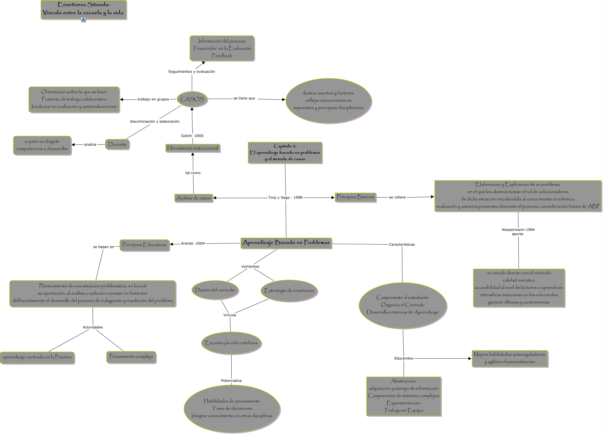 Este Cmap, tiene información relacionada con: Capítulo 3, Estrategia de enseñanza Vincula Escuela y la vida cotidiana, CASOS discriminación y elaboración Docente, CASOS se tiene que ilustrar asuntos y factores reflejar marcos teóricos supuestos y principios disciplinarios, Principios Educativos se basan en Planteamiento de una situación problematica, en la cual su aportación, al análisis o solución consiste en fomentar deliberadamente el desarrollo del proceso de indagación y resolución del problema, Elaboracion y Explicacion de un problema en el que los alumnos toman el rol de solucionadores de dicha situación vinculandola al conocimiento académico; evaluación y asesoria presentes duerante el proceso, consideración futura de ABP Wassermann-1994 aporta un vinculo directo con el currículo calidad narrativa accesibilidad al nivel de lectores o aprendices intensificar emociones en los educandos generar dilemas y controversias, Capítulo 3: El aprendizaje basado en problemas y el metodo de casos Torp y Sage - 1998 Aprendizaje Basado en Problemas, CASOS Seguimientos y evaluación Información del proceso Trascender en la Evaluación Feedback, CASOS trabajo en grupos Orientación sobre lo que se hace Fomento de trabajo colaborativo Involucrar en evaluación y autoevaluaciones, Diseño del curriculo Vincula Escuela y la vida cotidiana, Aprendizaje Basado en Problemas Vertientes Diseño del curriculo, Capítulo 3: El aprendizaje basado en problemas y el metodo de casos Torp y Sage - 1998 Análisis de casos, Aprendizaje Basado en Problemas Arends -2004 Principios Educativos, Planteamiento de una situación problematica, en la cual su aportación, al análisis o solución consiste en fomentar deliberadamente el desarrollo del proceso de indagación y resolución del problema Actividades Pensamiento complejo, Compromete al estudiante Organiza el Currículo Desarrolla entornos de Aprendizaje Educandos Mejora habilidades autoreguladoras y agilizan el pesnadmiento, Docente analiza a quién va dirigido competencias a desarrollar, Escuela y la vida cotidiana Potencializa Habilidades de pensamiento Toma de decisiones Integrar conocimiento en otras disciplinas, Herramienta instruccional Golich -2000 CASOS, Capítulo 3: El aprendizaje basado en problemas y el metodo de casos Torp y Sage - 1998 Principios Básicos, Aprendizaje Basado en Problemas Vertientes Estrategia de enseñanza, Principios Básicos se refiere Elaboracion y Explicacion de un problema en el que los alumnos toman el rol de solucionadores de dicha situación vinculandola al conocimiento académico; evaluación y asesoria presentes duerante el proceso, consideración futura de ABP