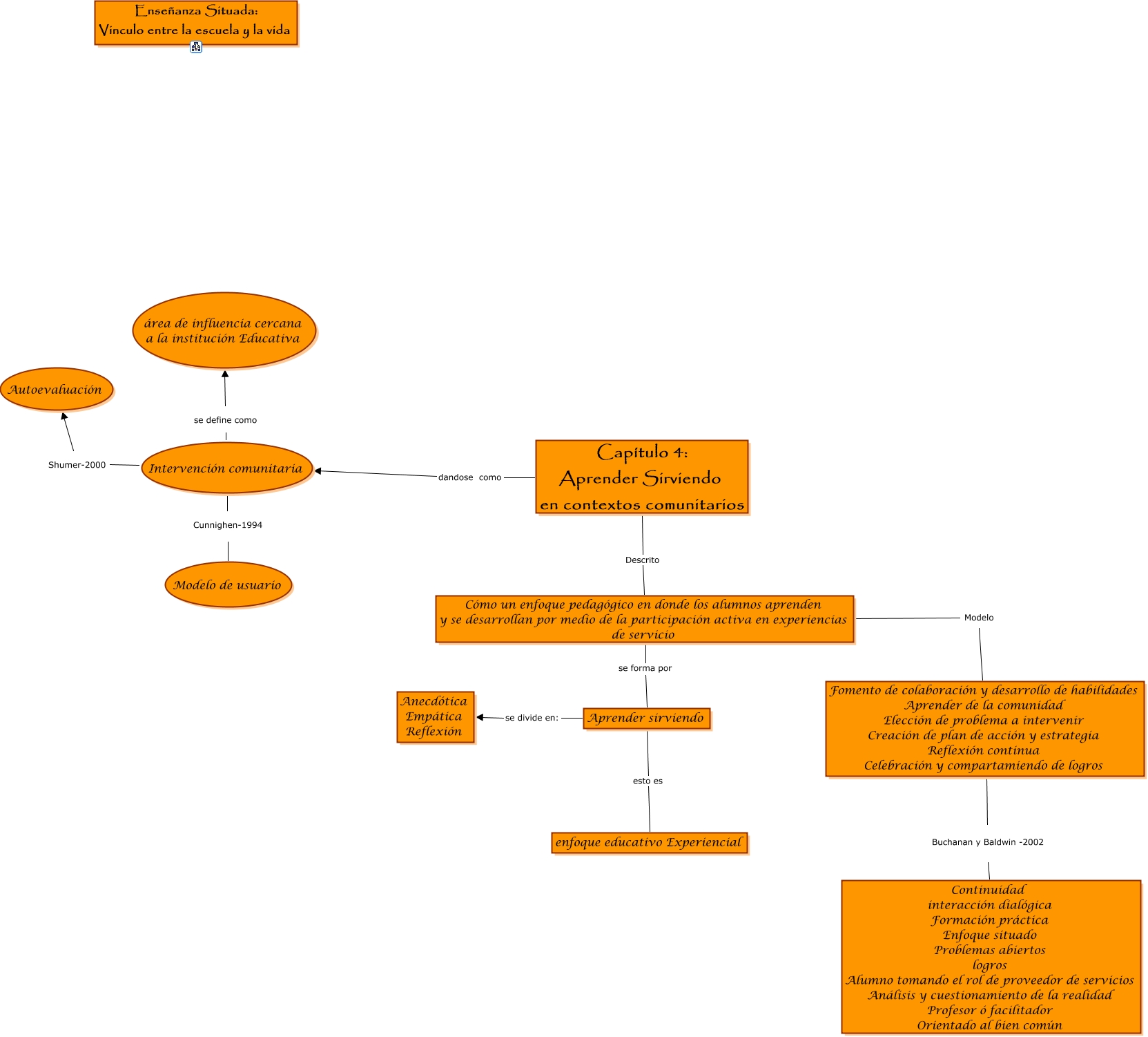 Este Cmap, tiene información relacionada con: Capítulo 4, Aprender sirviendo se divide en: Anecdótica Empática Reflexión, Aprender sirviendo esto es enfoque educativo Experiencial, Intervención comunitaria Shumer-2000 Autoevaluación, Intervención comunitaria se define como área de influencia cercana a la institución Educativa, Fomento de colaboración y desarrollo de habilidades Aprender de la comunidad Elección de problema a intervenir Creación de plan de acción y estrategia Reflexión continua Celebración y compartamiendo de logros Buchanan y Baldwin -2002 Continuidad interacción dialógica Formación práctica Enfoque situado Problemas abiertos logros Alumno tomando el rol de proveedor de servicios Análisis y cuestionamiento de la realidad Profesor ó facilitador Orientado al bien común, Intervención comunitaria Cunnighen-1994 Modelo de usuario, Capítulo 4: Aprender Sirviendo en contextos comunitarios Descrito Cómo un enfoque pedagógico en donde los alumnos aprenden y se desarrollan por medio de la participación activa en experiencias de servicio, Cómo un enfoque pedagógico en donde los alumnos aprenden y se desarrollan por medio de la participación activa en experiencias de servicio se forma por Aprender sirviendo, Capítulo 4: Aprender Sirviendo en contextos comunitarios dandose como Intervención comunitaria, Cómo un enfoque pedagógico en donde los alumnos aprenden y se desarrollan por medio de la participación activa en experiencias de servicio Modelo Fomento de colaboración y desarrollo de habilidades Aprender de la comunidad Elección de problema a intervenir Creación de plan de acción y estrategia Reflexión continua Celebración y compartamiendo de logros