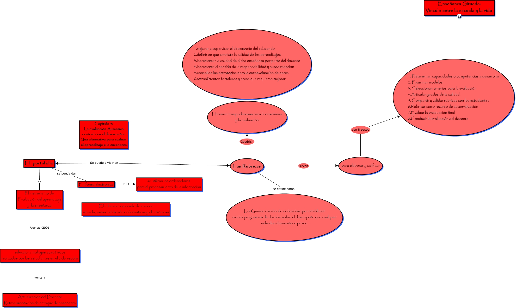Este Cmap, tiene información relacionada con: Capítulo 5, Capítulo 5: La evaluación Autentica centrada en el desempeño: Una alternativa para evaluar el aprendizaje y la enseñanza Se puede dividir en El portafolio, En forma electronica PRO El educando aprende de manera situada, varias habilidades informaticas y electrónicas, En forma electronica PRO se utilizan los ordenadores para el procesamiento de la información, Las Rubricas Goodrich Herramientas poderosas para la enseñanza y la evaluación, Capítulo 5: La evaluación Autentica centrada en el desempeño: Una alternativa para evaluar el aprendizaje y la enseñanza Se puede dividir en Las Rubricas, El instrumento de Evaluación del aprendizaje y la enseñanza Arends -2001 selecciona trabajos académicos realizados por los estudiantes en el ciclo escolar, Las Rubricas se define como Las Guias o escalas de evaluación que establecen niveles progresivos de dominio sobre el desempeño que cualquier individuo demuestra o posee., selecciona trabajos académicos realizados por los estudiantes en el ciclo escolar ventaja Actualización del Docente Retroalimentación de enfoque de enseñanza, El portafolio se puede dar En forma electronica, para elaborar y calificar con 8 pasos 1. Determinan capacidades o competencias a desarrollar 2. Examinan modelos 3. Seleccionan criterios para la evaluación 4.Articulan grados de la calidad 5. Compartir y validar rubricas con los estudiantes 6.Rubricar como recurso de autoevaluación 7.Evaluar la producción final 8.Conducir la evaluación del docente, Herramientas poderosas para la enseñanza y la evaluación esto permite 1.mejorar y supervisar el desempeño del educando 2.definir en que consiste la calidad de los aprendizajes 3.incrementar la calidad de dicha enseñanza por parte del docente 4.incrementa el sentido de la responsabilidad y autodireacción 5.consolida las estrategias para la autoevaluación de pares 6.retroalimentan fortalezas y areas que requieran mejorar, El portafolio es El instrumento de Evaluación del aprendizaje y la enseñanza, Las Rubricas sirven para elaborar y calificar