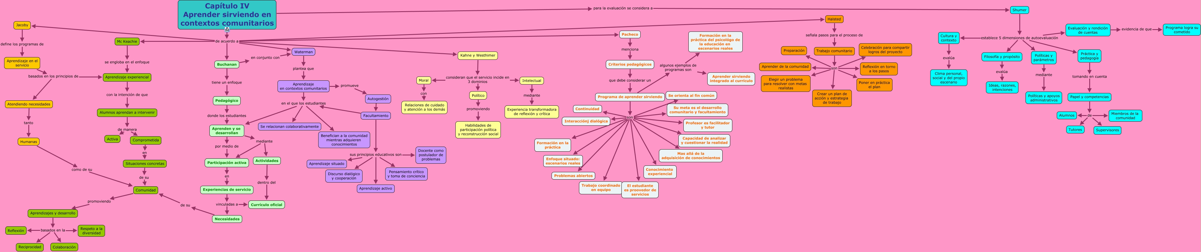 Este Cmap, tiene información relacionada con: capitulo IV, Jacoby define los programas de Aprendizaje en el servicio, Trabajo comunitario son Reflexión en torno a los pasos, Facultamiento en el que los estudiantes Aprenden y se desarrollan, Aprenden y se desarrollan mediante Participación activa, Kahne y Westhimer consideran que el servicio incide en 3 dominios Moral, Comprometida en Situaciones concretas, Halsted señala pasos para el proceso de Trabajo comunitario, Capítulo IV Aprender sirviendo en contextos comunitarios de acuerdo a Waterman, Facultamiento sus principios educativos son Pensamiento crítico y toma de conciencia, Programa de aprender sirviendo algunos ejemplos de programas son Aprender sirviendo integrado al currículo, Capítulo IV Aprender sirviendo en contextos comunitarios para la evaluación se considera a Shumer, Aprendizajes y desarrollo basados en la Respeto a la diversidad, Autogestión ???? Facultamiento, Aprendizaje en contextos comunitarios en el que los estudiantes Aprenden y se desarrollan, Alumnos aprendan a intervenir de manera Activa, Programa de aprender sirviendo son Enfoque situado: escenarios reales, Situaciones concretas de su Comunidad, Programa de aprender sirviendo son Su meta es el desarrollo comunitario y facultamiento, Papel y competencias de Tutores, Capítulo IV Aprender sirviendo en contextos comunitarios de acuerdo a Pacheco