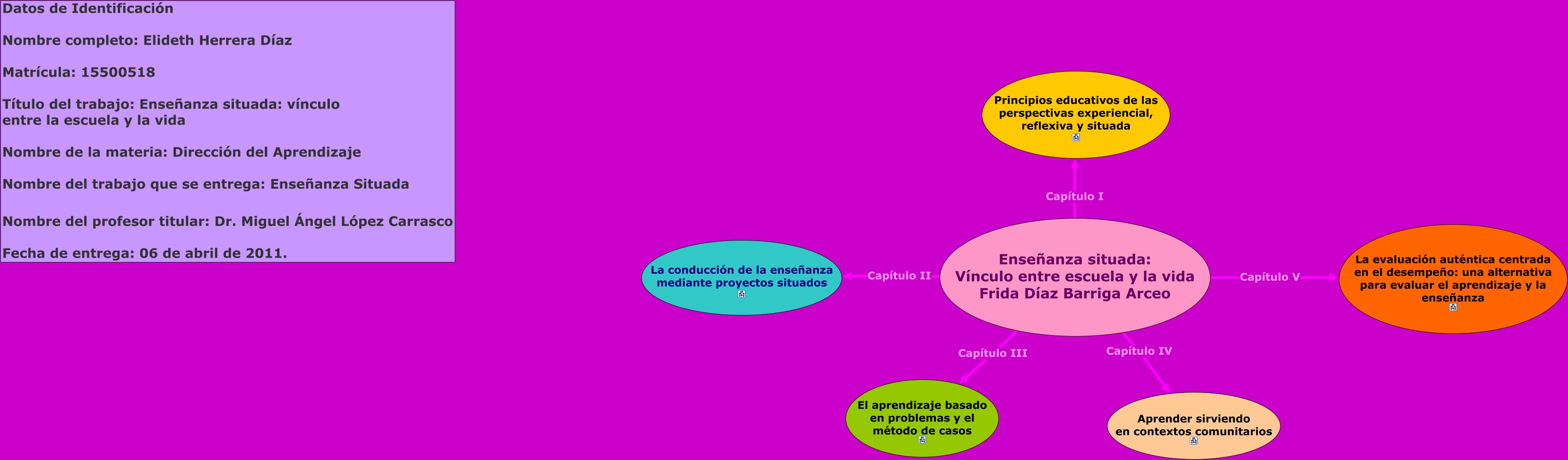 Este Cmap, tiene información relacionada con: mapa principal, Enseñanza situada: Vínculo entre escuela y la vida Frida Díaz Barriga Arceo Capítulo II La conducción de la enseñanza mediante proyectos situados, Enseñanza situada: Vínculo entre escuela y la vida Frida Díaz Barriga Arceo Capítulo V La evaluación auténtica centrada en el desempeño: una alternativa para evaluar el aprendizaje y la enseñanza, Enseñanza situada: Vínculo entre escuela y la vida Frida Díaz Barriga Arceo Capítulo I Principios educativos de las perspectivas experiencial, reflexiva y situada, Enseñanza situada: Vínculo entre escuela y la vida Frida Díaz Barriga Arceo Capítulo III El aprendizaje basado en problemas y el método de casos, Enseñanza situada: Vínculo entre escuela y la vida Frida Díaz Barriga Arceo Capítulo IV Aprender sirviendo en contextos comunitarios