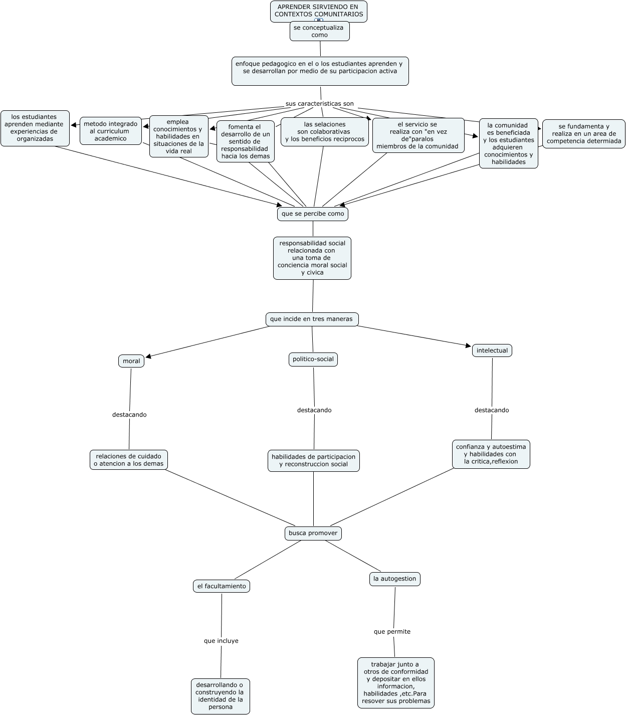 Este Cmap, tiene información relacionada con: CAPITULO 4, los estudiantes aprenden mediante experiencias de organizadas ???? que se percibe como, la comunidad es beneficiada y los estudiantes adquieren conocimientos y habilidades ???? que se percibe como, politico-social destacando habilidades de participacion y reconstruccion social, habilidades de participacion y reconstruccion social ???? busca promover, que incide en tres maneras ???? intelectual, fomenta el desarrollo de un sentido de responsabilidad hacia los demas ???? que se percibe como, intelectual destacando confianza y autoestima y habilidades con la critica,reflexion, emplea conocimientos y habilidades en situaciones de la vida real ???? que se percibe como, enfoque pedagogico en el o los estudiantes aprenden y se desarrollan por medio de su participacion activa sus caracteristicas son los estudiantes aprenden mediante experiencias de organizadas, enfoque pedagogico en el o los estudiantes aprenden y se desarrollan por medio de su participacion activa sus caracteristicas son fomenta el desarrollo de un sentido de responsabilidad hacia los demas, busca promover ???? la autogestion, confianza y autoestima y habilidades con la critica,reflexion ???? busca promover, enfoque pedagogico en el o los estudiantes aprenden y se desarrollan por medio de su participacion activa sus caracteristicas son el servicio se realiza con "en vez de"paralos miembros de la comunidad, que se percibe como ???? responsabilidad social relacionada con una toma de conciencia moral social y civica, la autogestion que permite trabajar junto a otros de conformidad y depositar en ellos informacion, habilidades ,etc.Para resover sus problemas, responsabilidad social relacionada con una toma de conciencia moral social y civica ???? que incide en tres maneras, se conceptualiza como ???? enfoque pedagogico en el o los estudiantes aprenden y se desarrollan por medio de su participacion activa, que incide en tres maneras ???? moral, moral destacando relaciones de cuidado o atencion a los demas, enfoque pedagogico en el o los estudiantes aprenden y se desarrollan por medio de su participacion activa sus caracteristicas son las selaciones son colaborativas y los beneficios reciprocos
