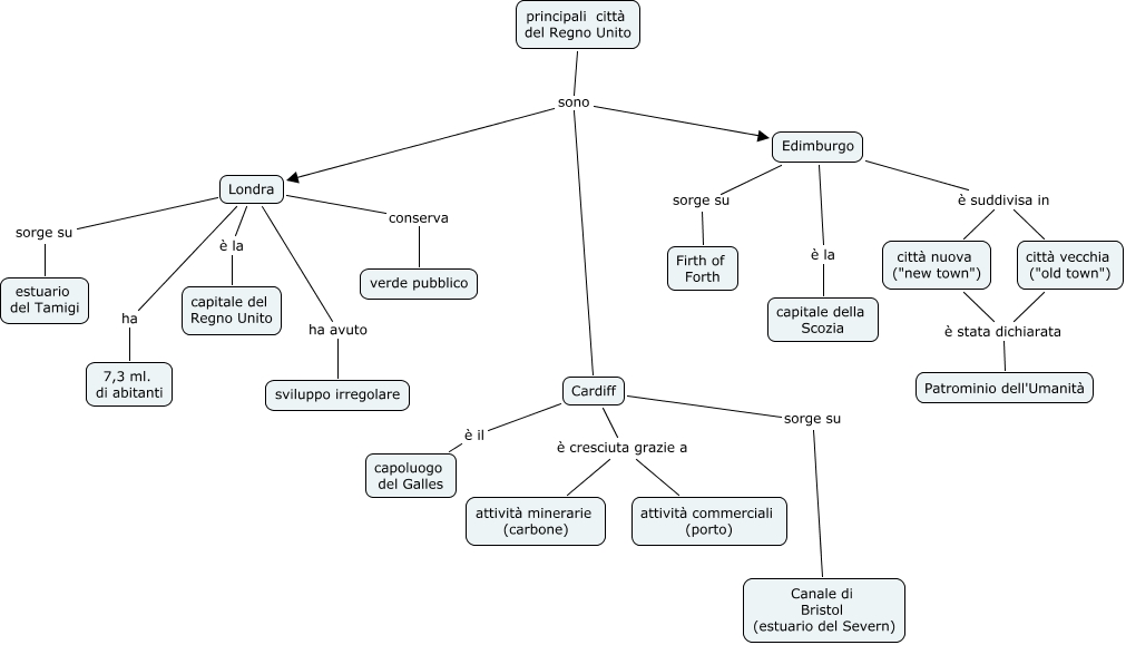 Questa Cmap, creata con IHMC CmapTools, contiene informazioni relative a: 251) Regno Unito - città, Edimburgo è suddivisa in città nuova ("new town"), principali città del Regno Unito sono Londra, Cardiff è cresciuta grazie a attività commerciali (porto), Cardiff è cresciuta grazie a attività minerarie (carbone), Londra conserva verde pubblico, principali città del Regno Unito sono Cardiff, Edimburgo è suddivisa in città vecchia ("old town"), Cardiff è il capoluogo del Galles, Cardiff sorge su Canale di Bristol (estuario del Severn), Londra ha avuto sviluppo irregolare, città nuova ("new town") è stata dichiarata Patrominio dell'Umanità, città vecchia ("old town") è stata dichiarata Patrominio dell'Umanità, Londra è la capitale del Regno Unito, Londra ha 7,3 ml. di abitanti, principali città del Regno Unito sono Edimburgo, Edimburgo è la capitale della Scozia, Edimburgo sorge su Firth of Forth, Londra sorge su estuario del Tamigi