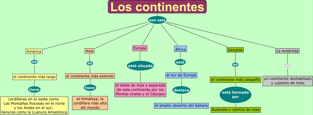 Este Cmap, tiene información relacionada con: Los continentes, el continente más largo tiene cordilleras en el oeste como Las Montañas Rocosas en el norte y los Andes en el sur; llanuras como la LLanura Amazónica, África está al sur de Europa, Oceanía es el continente más pequeño, Europa está situada al oeste de Asia y separada de este continente por los Montes Urales y el Cáucaso, Los continentes son seis Oceanía, el continente más extenso tiene el Himalaya, la cordillera más alta del mundo, América es el continente más largo, Los continentes son seis América, al sur de Europa destaca el amplio desierto del Sahara, Los continentes son seis Asia, Los continentes son seis África, Los continentes son seis La Antártida, La Antártida es un continente deshabitado y cubierto de hielo, el continente más pequeño está formado por Australia y cientos de islas, Asia es el continente más extenso, Los continentes son seis Europa