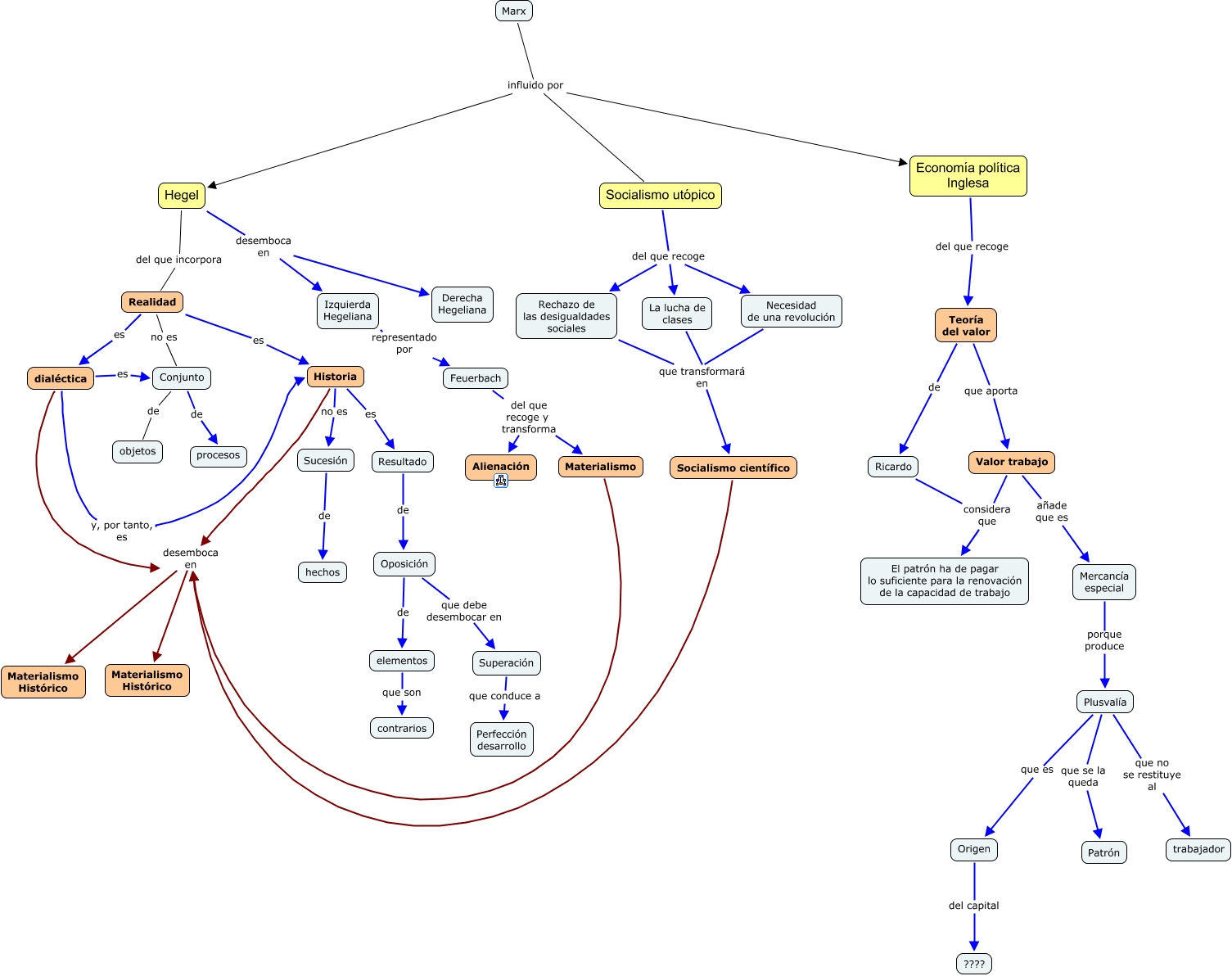 Este Cmap, tiene información relacionada con: Marx_0, Necesidad de una revolución que transformará en Socialismo científico, Izquierda Hegeliana representado por Feuerbach, Hegel del que incorpora Realidad, Marx influido por Economía política Inglesa, Historia no es Sucesión, Plusvalía que es Origen, dialéctica desemboca en Materialismo Histórico, Realidad es dialéctica, elementos que son contrarios, Economía política Inglesa del que recoge Teoría del valor, Oposición de elementos, La lucha de clases que transformará en Socialismo científico, Oposición que debe desembocar en Superación, Historia es Resultado, Materialismo desemboca en Materialismo Histórico, Historia desemboca en Materialismo Histórico, Teoría del valor de Ricardo, Socialismo científico desemboca en Materialismo Histórico, Materialismo desemboca en Materialismo Histórico, Origen del capital ????