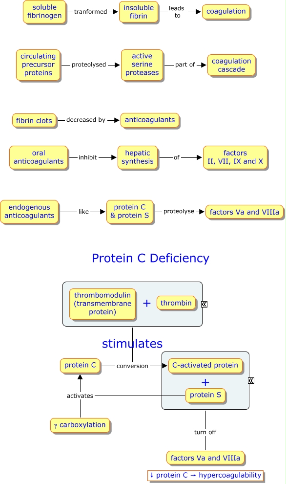This Concept Map, created with IHMC CmapTools, has information related to: overview, active serine proteases part of coagulation cascade, endogenous anticoagulants like protein C & protein S, fibrin clots decreased by anticoagulants, soluble fibrinogen tranformed insoluble fibrin, ???? turn off factors Va and VIIIa, ???? conversion C-activated protein, protein C & protein S proteolyse factors Va and VIIIa, circulating precursor proteins proteolysed active serine proteases, oral anticoagulants inhibit hepatic synthesis, insoluble fibrin leads to coagulation, protein S activates protein C, hepatic synthesis of factors II, VII, IX and X, γ carboxylation activates protein C, protein C conversion C-activated protein