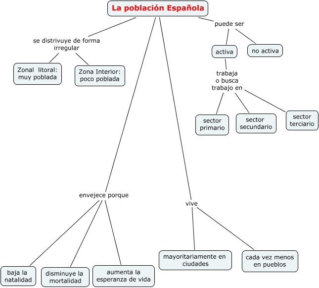 Este Cmap, tiene información relacionada con: la población española, activa trabaja o busca trabajo en sector secundario, La población Española vive mayoritariamente en ciudades, activa trabaja o busca trabajo en sector terciario, activa trabaja o busca trabajo en sector primario, La población Española puede ser activa, La población Española envejece porque aumenta la esperanza de vida, La población Española se distrivuye de forma irregular Zona Interior: poco poblada, La población Española envejece porque disminuye la mortalidad, La población Española puede ser no activa, La población Española vive cada vez menos en pueblos, La población Española se distrivuye de forma irregular Zonal litoral: muy poblada, La población Española envejece porque baja la natalidad