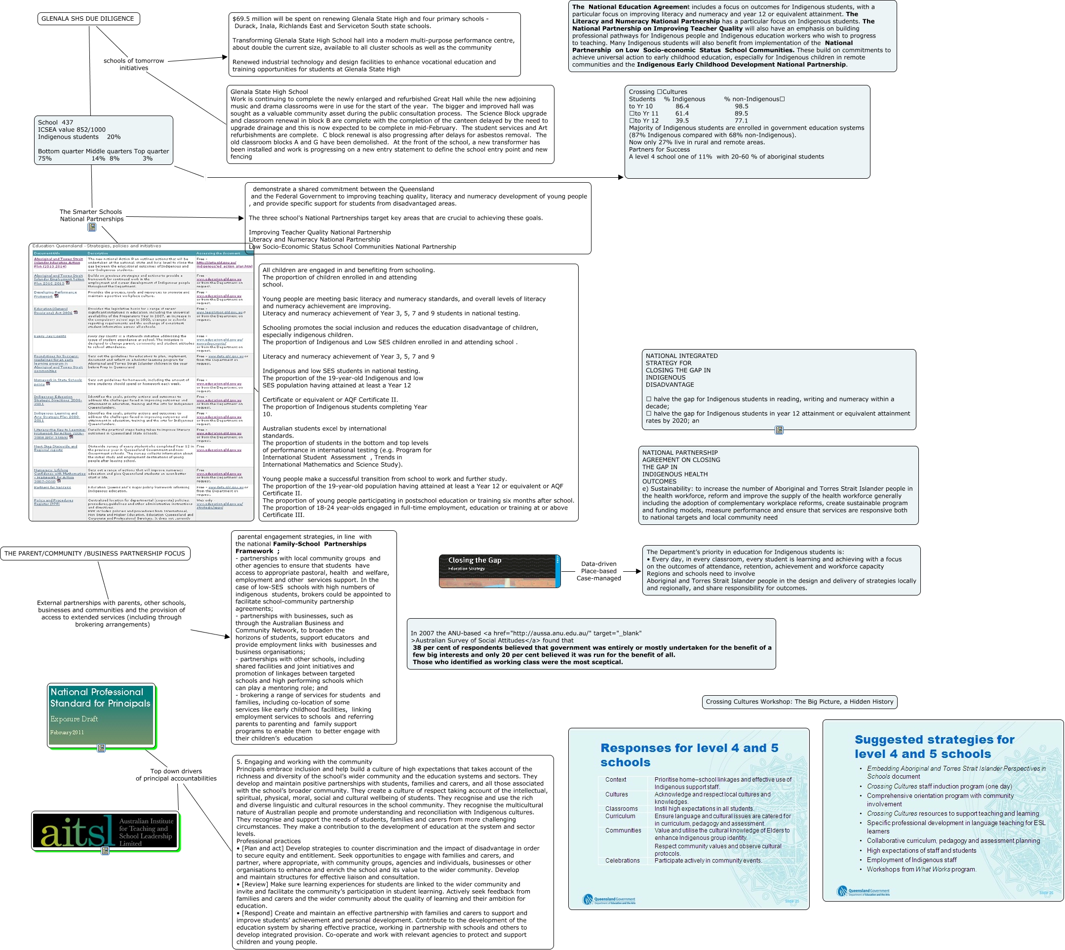 This Concept Map, created with IHMC CmapTools, has information related to: THE POLICY FRAMEWORK GLENALA SHS, Top down drivers of principal accountabilities 5. Engaging and working with the community Principals embrace inclusion and help build a culture of high expectations that takes account of the richness and diversity of the school’s wider community and the education systems and sectors. They develop and maintain positive partnerships with students, families and carers, and all those associated with the school’s broader community. They create a culture of respect taking account of the intellectual, spiritual, physical, moral, social and cultural wellbeing of students. They recognise and use the rich and diverse linguistic and cultural resources in the school community. They recognise the multicultural nature of Australian people and promote understanding and reconciliation with Indigenous cultures. They recognise and support the needs of students, families and carers from more challenging circumstances. They make a contribution to the development of education at the system and sector levels. Professional practices • [Plan and act] Develop strategies to counter discrimination and the impact of disadvantage in order to secure equity and entitlement. Seek opportunities to engage with families and carers, and partner, where appropriate, with community groups, agencies and individuals, businesses or other organisations to enhance and enrich the school and its value to the wider community. Develop and maintain structures for effective liaison and consultation. • [Review] Make sure learning experiences for students are linked to the wider community and invite and facilitate the community’s participation in student learning. Actively seek feedback from families and carers and the wider community about the quality of learning and their ambition for education. • [Respond] Create and maintain an effective partnership with families and carers to support and improve students’ achievement and personal development. Contribute to the development of the education system by sharing effective practice, working in partnership with schools and others to develop integrated provision. Co-operate and work with relevant agencies to protect and support children and young people., GLENALA SHS DUE DILIGENCE The Smarter Schools National Partnerships All children are engaged in and benefiting from schooling. The proportion of children enrolled in and attending school. Young people are meeting basic literacy and numeracy standards, and overall levels of literacy and numeracy achievement are improving. Literacy and numeracy achievement of Year 3, 5, 7 and 9 students in national testing. Schooling promotes the social inclusion and reduces the education disadvantage of children, especially indigenous children. The proportion of Indigenous and Low SES children enrolled in and attending school . Literacy and numeracy achievement of Year 3, 5, 7 and 9 Indigenous and low SES students in national testing. The proportion of the 19-year-old Indigenous and low SES population having attained at least a Year 12 Certificate or equivalent or AQF Certificate II. The proportion of Indigenous students completing Year 10. Australian students excel by international standards. The proportion of students in the bottom and top levels of performance in international testing (e.g. Program for International Student Assessment , Trends in International Mathematics and Science Study). Young people make a successful transition from school to work and further study. The proportion of the 19-year-old population having attained at least a Year 12 or equivalent or AQF Certificate II. The proportion of young people participating in postschool education or training six months after school. The proportion of 18-24 year-olds engaged in full-time employment, education or training at or above Certificate III., GLENALA SHS DUE DILIGENCE schools of tomorrow initiatives Glenala State High School Work is continuing to complete the newly enlarged and refurbished Great Hall while the new adjoining music and drama classrooms were in use for the start of the year. The bigger and improved hall was sought as a valuable community asset during the public consultation process. The Science Block upgrade and classroom renewal in block B are complete with the completion of the canteen delayed by the need to upgrade drainage and this is now expected to be complete in mid-February. The student services and Art refurbishments are complete. C block renewal is also progressing after delays for asbestos removal. The old classroom blocks A and G have been demolished. At the front of the school, a new transformer has been installed and work is progressing on a new entry statement to define the school entry point and new fencing, School 437 ICSEA value 852/1000 Indigenous students 20% Bottom quarter Middle quarters Top quarter 75% 14% 8% 3% Crossing Cultures Students % Indigenous % non-Indigenous to Yr 10 86.4 98.5 to Yr 11 61.4 89.5 to Yr 12 39.5 77.1 Majority of Indigenous students are enrolled in government education systems (87% Indigenous compared with 68% non-Indigenous). Now only 27% live in rural and remote areas. Partners for Success A level 4 school one of 11% with 20-60 % of aboriginal students, Data-driven Place-based Case-managed The Department’s priority in education for Indigenous students is: • Every day, in every classroom, every student is learning and achieving with a focus on the outcomes of attendance, retention, achievement and workforce capacity Regions and schools need to involve Aboriginal and Torres Strait Islander people in the design and delivery of strategies locally and regionally, and share responsibility for outcomes., GLENALA SHS DUE DILIGENCE The Smarter Schools National Partnerships demonstrate a shared commitment between the Queensland and the Federal Government to improving teaching quality, literacy and numeracy developmen