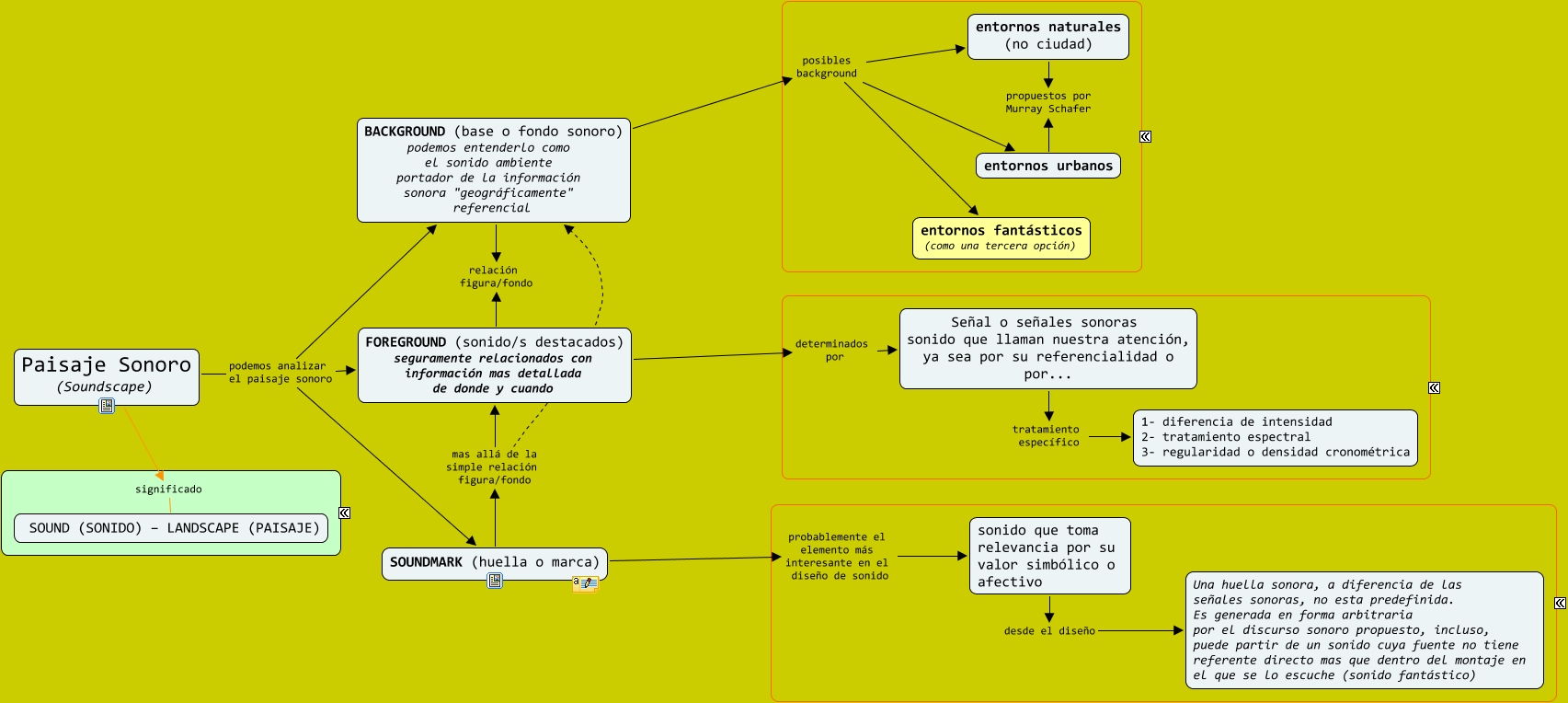 Este Cmap, tiene información relacionada con: paisaje sonoro, Paisaje Sonoro (Soundscape) podemos analizar el paisaje sonoro BACKGROUND (base o fondo sonoro) podemos entenderlo como el sonido ambiente portador de la información sonora "geográficamente" referencial, SOUNDMARK (huella o marca) mas allá de la simple relación figura/fondo BACKGROUND (base o fondo sonoro) podemos entenderlo como el sonido ambiente portador de la información sonora "geográficamente" referencial, BACKGROUND (base o fondo sonoro) podemos entenderlo como el sonido ambiente portador de la información sonora "geográficamente" referencial posibles background entornos fantásticos (como una tercera opción), SOUNDMARK (huella o marca) mas allá de la simple relación figura/fondo FOREGROUND (sonido/s destacados) seguramente relacionados con información mas detallada de donde y cuando, FOREGROUND (sonido/s destacados) seguramente relacionados con información mas detallada de donde y cuando determinados por Señal o señales sonoras sonido que llaman nuestra atención, ya sea por su referencialidad o por..., BACKGROUND (base o fondo sonoro) podemos entenderlo como el sonido ambiente portador de la información sonora "geográficamente" referencial posibles background entornos naturales (no ciudad), BACKGROUND (base o fondo sonoro) podemos entenderlo como el sonido ambiente portador de la información sonora "geográficamente" referencial posibles background entornos urbanos, SOUNDMARK (huella o marca) probablemente el elemento más interesante en el diseño de sonido sonido que toma relevancia por su valor simbólico o afectivo, Señal o señales sonoras sonido que llaman nuestra atención, ya sea por su referencialidad o por... tratamiento específico 1- diferencia de intensidad 2- tratamiento espectral 3- regularidad o densidad cronométrica, Paisaje Sonoro (Soundscape) significado SOUND (SONIDO) – LANDSCAPE (PAISAJE), sonido que toma relevancia por su valor simbólico o afectivo desde el diseño Una huella sonora, a diferencia de las señales sonoras, no esta predefinida. Es generada en forma arbitraria por el discurso sonoro propuesto, incluso, puede partir de un sonido cuya fuente no tiene referente directo mas que dentro del montaje en el que se lo escuche (sonido fantástico), Paisaje Sonoro (Soundscape) podemos analizar el paisaje sonoro SOUNDMARK (huella o marca), Paisaje Sonoro (Soundscape) podemos analizar el paisaje sonoro FOREGROUND (sonido/s destacados) seguramente relacionados con información mas detallada de donde y cuando