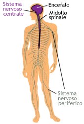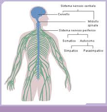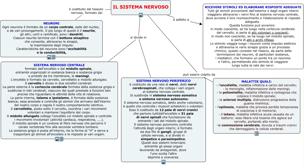 Questa Cmap, creata con IHMC CmapTools, contiene informazioni relative a: Il sistema nervoso, IL SISTEMA NERVOSO è adibito a RICEVERE STIMOLI ED ELABORARE RISPOSTE ADEGUATE Tutti gli stimoli provenienti dall'esterno e dagli organi interni viaggiano attraverso i nervi fino al sistema nervoso centrale, dove avviene il loro riconoscimento e l'elaborazione di risposte adeguate. Questa funzione può avvenire: in modo cosciente, se ha luogo nella corteccia cerebrale del cervello, si parla di atti volontari o coscienti; in modo non cosciente, se ha luogo nel midollo spinale, si parla di atti o archi riflessi. Lo stimolo viaggia lungo i neuroni come impulso elettrico e attraversa le varie sinapsi grazie a un processo chimico; questo consiste nel rilascio, da parte delle terminazioni dei neuroni, di particolari sostanze, i mediatori, che formano un ponte tra un neurone e l'altro, permettendo allo stimolo di viaggiare lungo tutta la rete dei nervi., IL SISTEMA NERVOSO si divide in SISTEMA NERVOSO CENTRALE formato dall'encefalo e dal midollo spinale, entrambi organizzati in sostanza bianca e sostanza grigia e protetti da tre membrane, le meningi. L'encefalo è formato da cervello, cervelletto e midollo allungato. Il cervello è diviso in due emisferi cerebrali. La parte esterna è la corteccia cerebrale formata dalla sostanza grigia e suddivisa in lobi cerebrali, ciascuno dei quali presiede a funzioni ben precise che riguardano le attività della vita di relazione. La parte interna, talamo e ipotalamo, è formata dalla sostanza bianca; essa presiede e controlla gli stimoli che arrivano dall'interno del nostro corpo e regola il nostro comportamento istintivo. Il cervelletto, posto sotto il cervello, coordina i vari movimenti volontari e mantiene l'equilibrio del corpo. Il midollo allungato collega l'encefalo col midollo spinale e controlla i movimenti involontari (attività cardiaca, respiratoria, ....). Il midollo spinale è un cordone di fibre nervose che percorre il canale vertebrale fino alla seconda vertebra lombare. La sostanza grigia è posta all'interno, ha la forma di "H" e serve a trasportare gli stimoli all'encefalo e le risposte ai vari organi., IL SISTEMA NERVOSO si divide in SISTEMA NERVOSO PERIFERICO è costituito da una rete di nervi, detti nervi cerebrospinali, che collega i vari organi al sistema nervoso centrale. Si suddivide in sistema nervoso somatico e sistema nervoso autonomo. Il sistema nervoso somatico, detto anche volontario, è quello che controlla i muscoli scheletrici o volontari. Esso è costituito da 12 paia di nervi cranici che partono tuttidall'encefalo e 31 paia di nervi spinali che fuoriescono da entrambi i lati del midollo spinale. Il sistema nervoso autonomo controlla l'attività degli organi interni; è formato da due file di gangli, gruppi di cellule nervose, e si divide in simpatico e parasimpatico. Questi due sistemi innervano entrembi gli stessi organi lavorando da antagonisti, dove l'uno eccita l'altro deprime e viceversa., IL SISTEMA NERVOSO è costituito dal tessuto nervoso, formato dai NEURONI Ogni neurone è formato da un corpo centrale, sede del nucleo, e da vari prolungamenti. Il più lungo di questi è il neurite, gli altri, corti e ramificati, sono i dendriti. Ciascun neurite termina con il bottone sinaptico che consente, attraverso la sinapsi, la trasmissione degli impulsi. Caratteristiche del neurone sono l'eccitabilità e la conducibilità., IL SISTEMA NERVOSO può essere colpito da MALATTIE QUALI: - l'encefalite, malattia infettiva a carico del cervello; - la meningite, infiammazione delle meningi; - la poliomielite, malattia infettiva e contagiosa che colpisce il midollo spinale; - la sclerosi multipla, distruzione prograssiva della guaina mielinica; - l'epilessia, malattia che provoca perdita temporanea di coscienza e di memoria; - il tetano, malattia infettiva acuta causata da un batterio: esso libera una tossina che agisce sul cervello, portando alla morte; -la commozione cerebrale, dovuta a traumi cranici che danneggiano le cellule cerebrali.