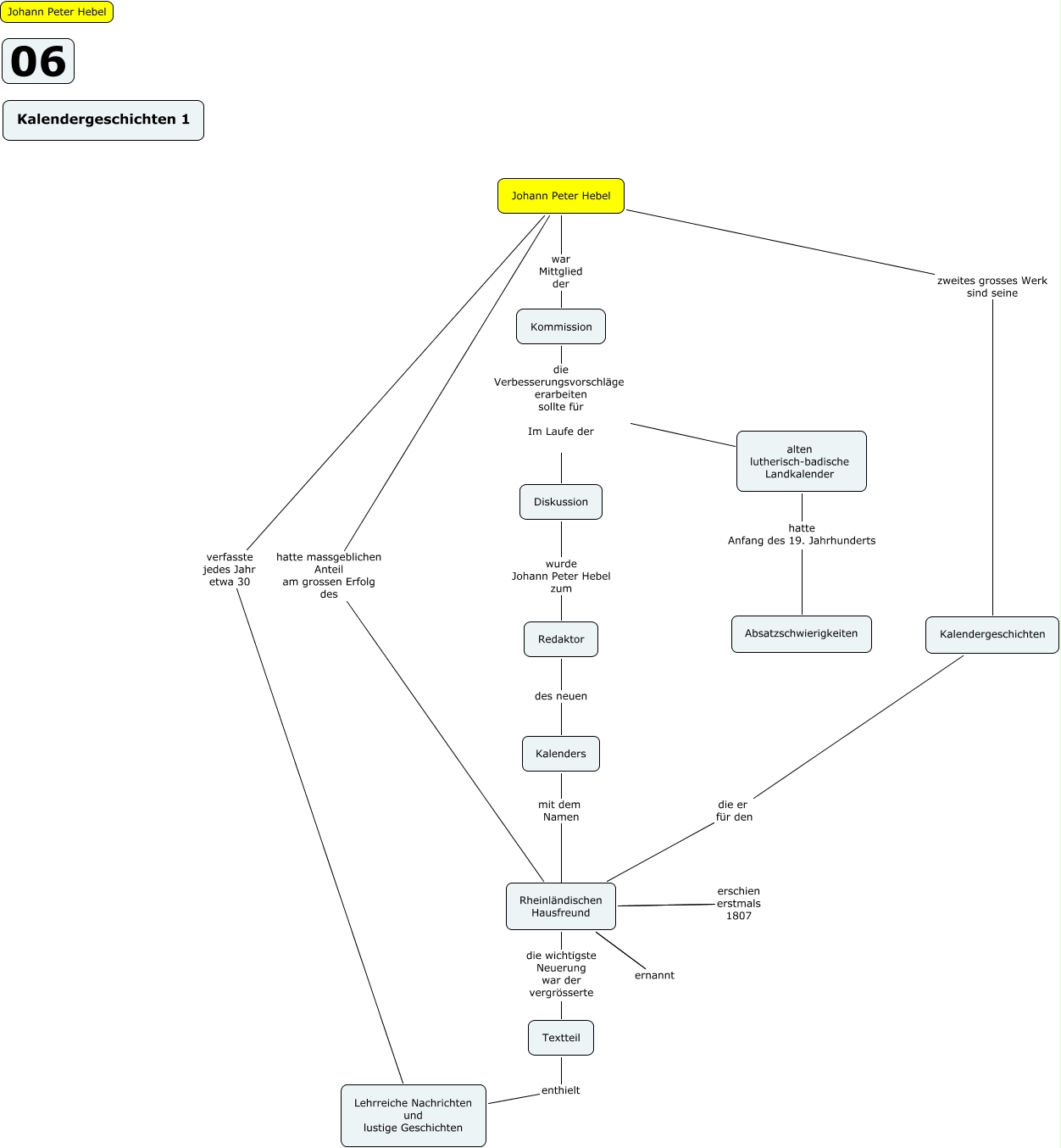 Dieses mit IHMC CmapTools erstellte CMap hat Informationen bezüglich: 06 Johann Peter Hebel Kalendergeschichten 1, Johann Peter Hebel zweites grosses Werk sind seine Kalendergeschichten, Johann Peter Hebel verfasste jedes Jahr etwa 30 Lehrreiche Nachrichten und lustige Geschichten, Diskussion wurde Johann Peter Hebel zum Redaktor, Rheinländischen Hausfreund die wichtigste Neuerung war der vergrösserte Textteil, Kalendergeschichten die er für den Rheinländischen Hausfreund, Textteil enthielt Lehrreiche Nachrichten und lustige Geschichten, alten lutherisch-badische Landkalender hatte Anfang des 19. Jahrhunderts Absatzschwierigkeiten, Kalenders mit dem Namen Rheinländischen Hausfreund, Johann Peter Hebel hatte massgeblichen Anteil am grossen Erfolg des Rheinländischen Hausfreund, Kommission die Verbesserungsvorschläge erarbeiten sollte für Im Laufe der alten lutherisch-badische Landkalender, Redaktor des neuen Kalenders, Johann Peter Hebel war Mittglied der Kommission, Kommission die Verbesserungsvorschläge erarbeiten sollte für Im Laufe der Diskussion