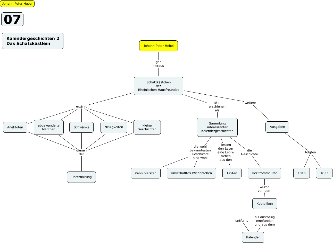 Dieses mit IHMC CmapTools erstellte CMap hat Informationen bezüglich: 07 Johann Peter Hebel Kalendergeschichten 2, Sammlung interessanter Kalendergeschichten die Geschichte Der fromme Rat, Sammlung interessanter Kalendergeschichten die wohl bekanntesten Geschichte sind wohl Unverhofftes Wiedersehen, abgewandelte Märchen dienen der Unterhaltung, Neuigkeiten dienen der Unterhaltung, Schatzkästchen des Rheinischen Hausfreundes erzählt abgewandelte Märchen, Schatzkästchen des Rheinischen Hausfreundes erzählt Schwänke, Schatzkästchen des Rheinischen Hausfreundes erzählt Anektoten, Johann Peter Hebel gab heraus Schatzkästchen des Rheinischen Hausfreundes, Ausgaben folgten 1827, Schatzkästchen des Rheinischen Hausfreundes weitere Ausgaben, Schatzkästchen des Rheinischen Hausfreundes 1811 erschienen als Sammlung interessanter Kalendergeschichten, Sammlung interessanter Kalendergeschichten liessen den Leser eine Lehre ziehen aus den Texten, Schwänke dienen der Unterhaltung, kleine Geschichten dienen der Unterhaltung, Schatzkästchen des Rheinischen Hausfreundes erzählt kleine Geschichten, Schatzkästchen des Rheinischen Hausfreundes erzählt Neuigkeiten, Katholiken als anstössig empfunden und aus dem Kalender, Der fromme Rat wurde von den Katholiken, Sammlung interessanter Kalendergeschichten die wohl bekanntesten Geschichte sind wohl Kannitverstan, Anektoten dienen der Unterhaltung