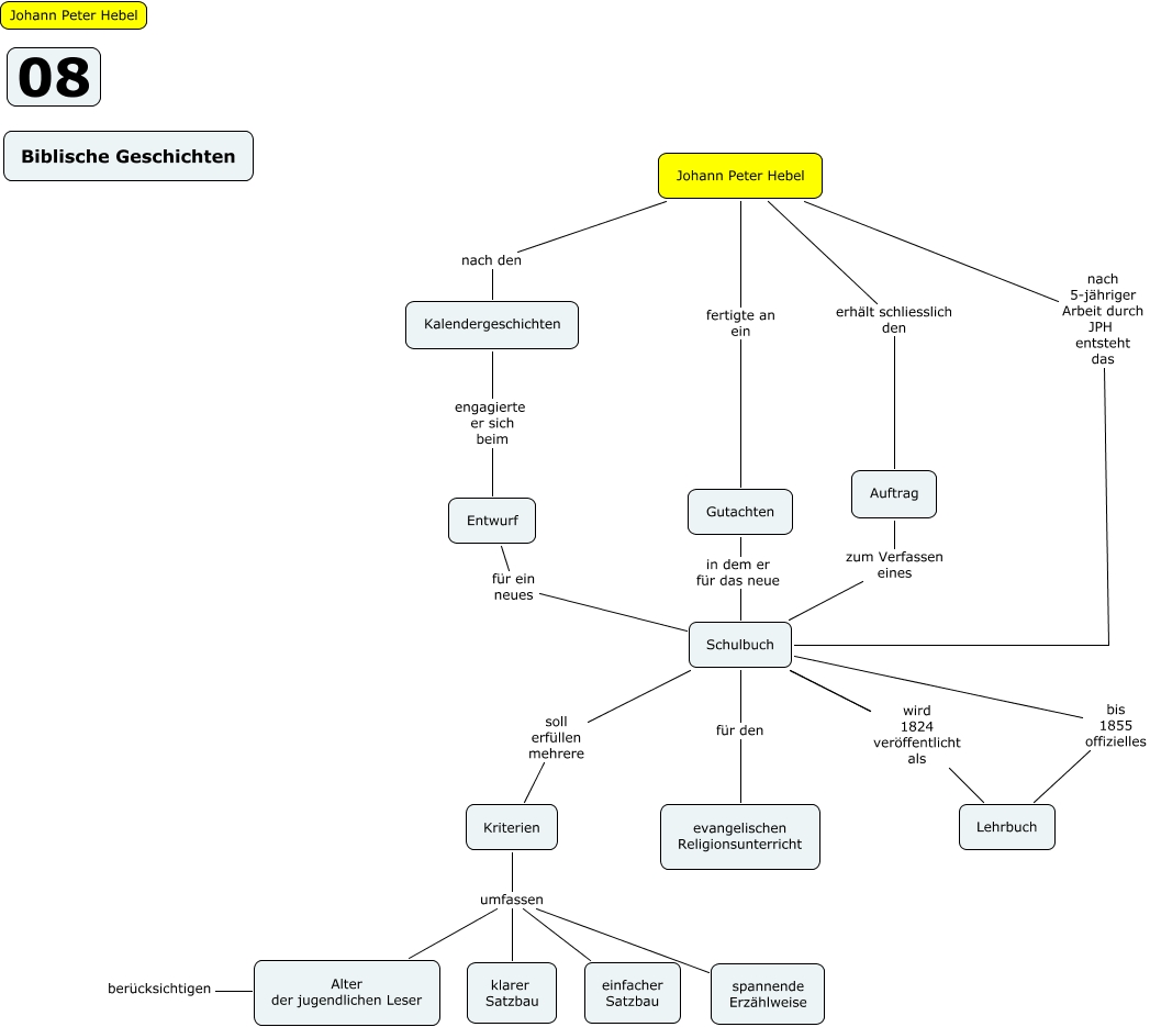 Dieses mit IHMC CmapTools erstellte CMap hat Informationen bezüglich: 08 Johann Peter Hebel Biblische Geschichten, Johann Peter Hebel erhält schliesslich den Auftrag, Kriterien umfassen Alter der jugendlichen Leser, Kriterien umfassen spannende Erzählweise, Schulbuch soll erfüllen mehrere Kriterien, Johann Peter Hebel fertigte an ein Gutachten, Kalendergeschichten engagierte er sich beim Entwurf, Johann Peter Hebel nach 5-jähriger Arbeit durch JPH entsteht das Schulbuch, Auftrag zum Verfassen eines Schulbuch, Kriterien umfassen einfacher Satzbau, Kriterien umfassen klarer Satzbau, Gutachten in dem er für das neue Schulbuch, Entwurf für ein neues Schulbuch, Johann Peter Hebel nach den Kalendergeschichten, Schulbuch wird 1824 veröffentlicht als Lehrbuch, Schulbuch bis 1855 offizielles Lehrbuch, Schulbuch für den evangelischen Religionsunterricht