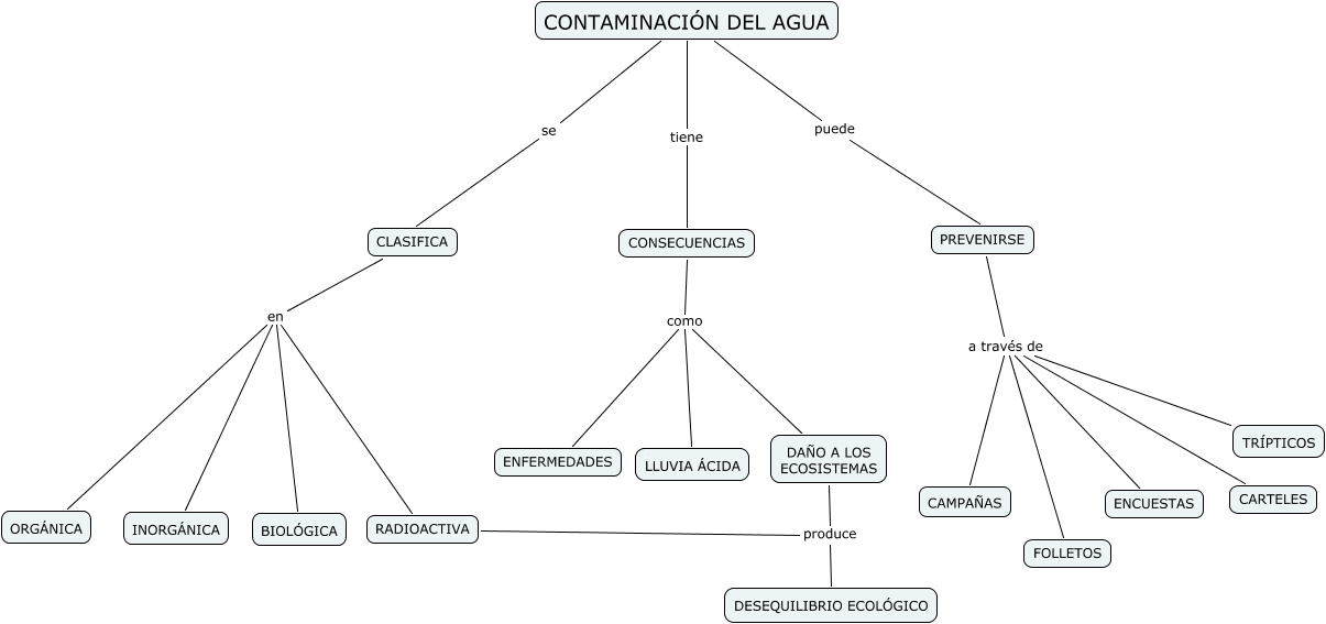 Este Cmap, tiene información relacionada con: Contaminación-AGUA, CLASIFICA en BIOLÓGICA, CLASIFICA en RADIOACTIVA, PREVENIRSE a través de TRÍPTICOS, CONTAMINACIÓN DEL AGUA se CLASIFICA, PREVENIRSE a través de FOLLETOS, CONTAMINACIÓN DEL AGUA puede PREVENIRSE, CLASIFICA en ORGÁNICA, RADIOACTIVA produce DESEQUILIBRIO ECOLÓGICO, PREVENIRSE a través de CAMPAÑAS, PREVENIRSE a través de ENCUESTAS, CONSECUENCIAS como ENFERMEDADES, DAÑO A LOS ECOSISTEMAS produce DESEQUILIBRIO ECOLÓGICO, CONSECUENCIAS como DAÑO A LOS ECOSISTEMAS, CONSECUENCIAS como LLUVIA ÁCIDA, PREVENIRSE a través de CARTELES, CLASIFICA en INORGÁNICA, CONTAMINACIÓN DEL AGUA tiene CONSECUENCIAS